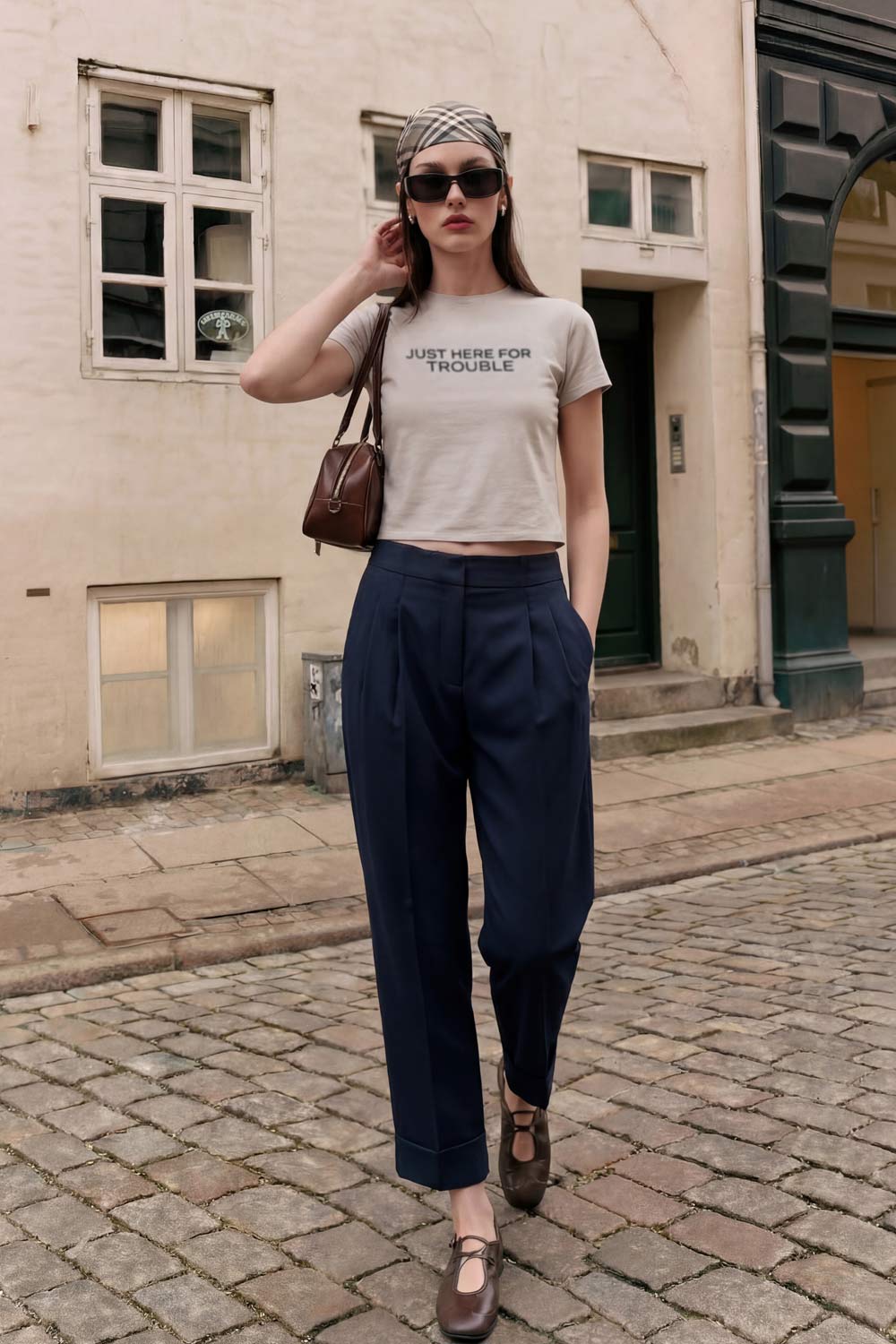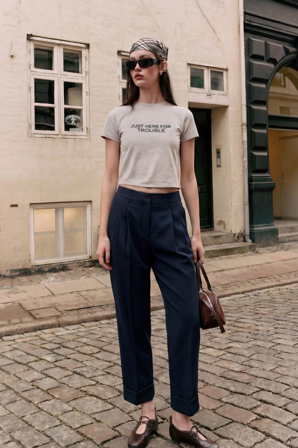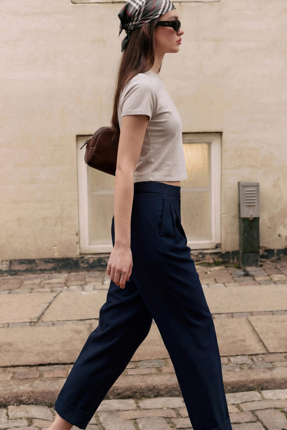 Pantalón de fit recto, cintura alta con pretina elástica posterior, pinzas frontales, bolsillos delanteros, vivo decorativo posterior y doblez en bajo. Cierre frontal con broche y cremallera ocultos.