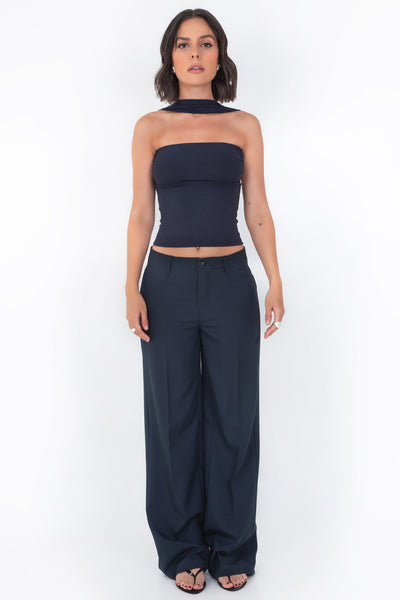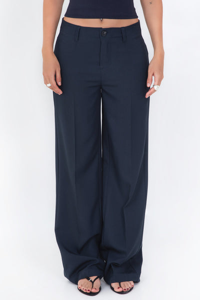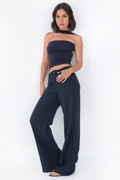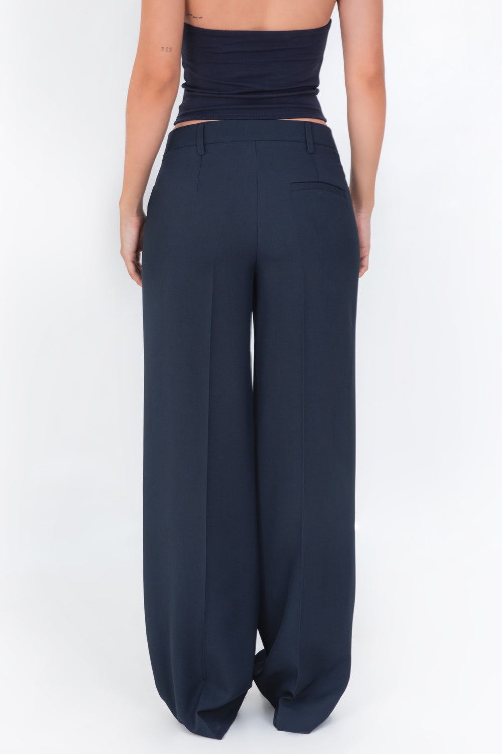 Pantalón de fit wide leg, cintura baja con pretina y trabillas, vivo decorativo posterior y detalle de raya frontal. Cierre frontal con botón y cremallera oculta.