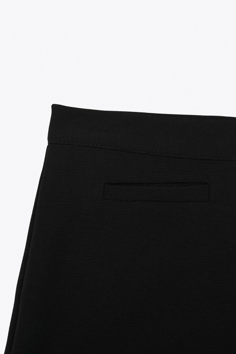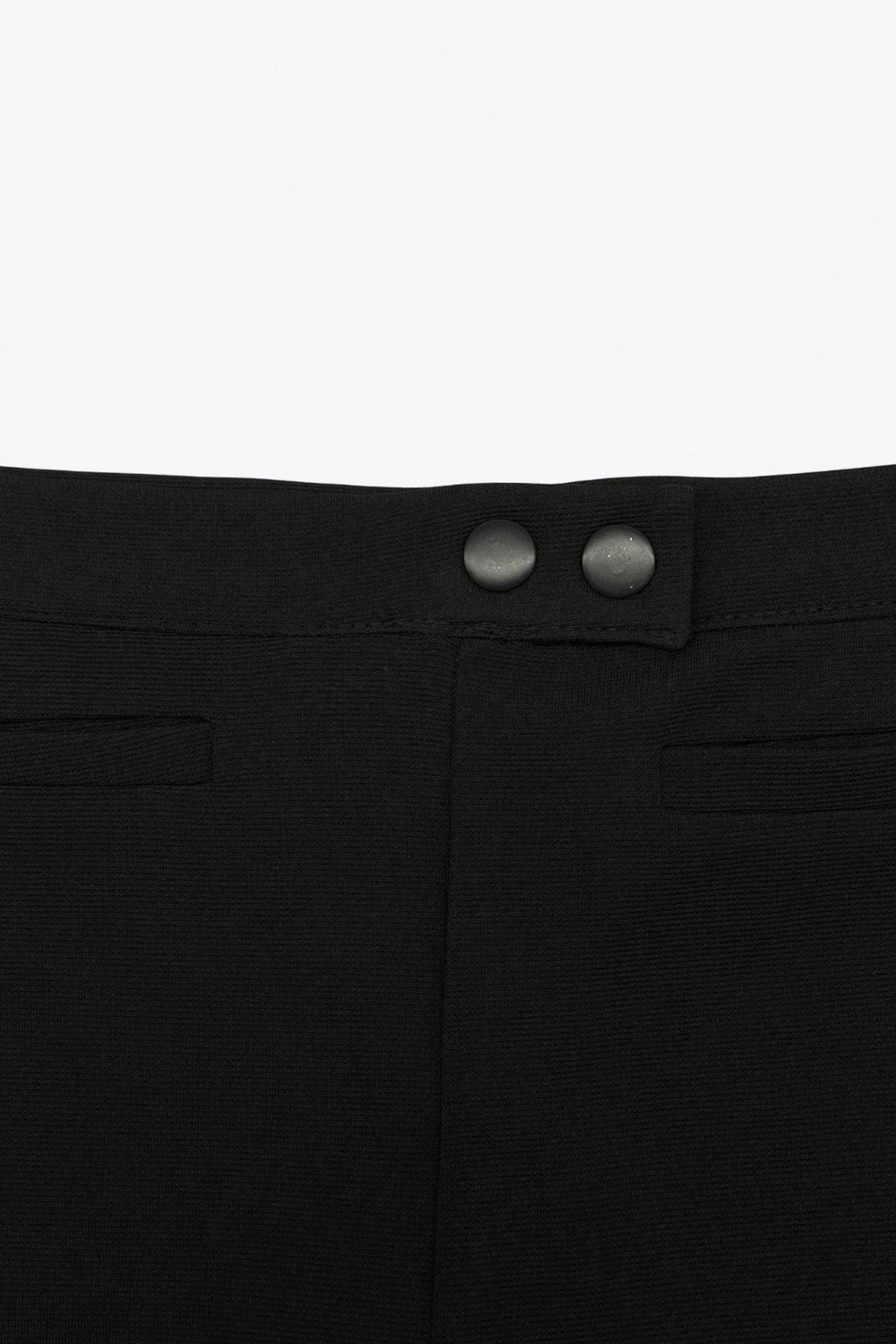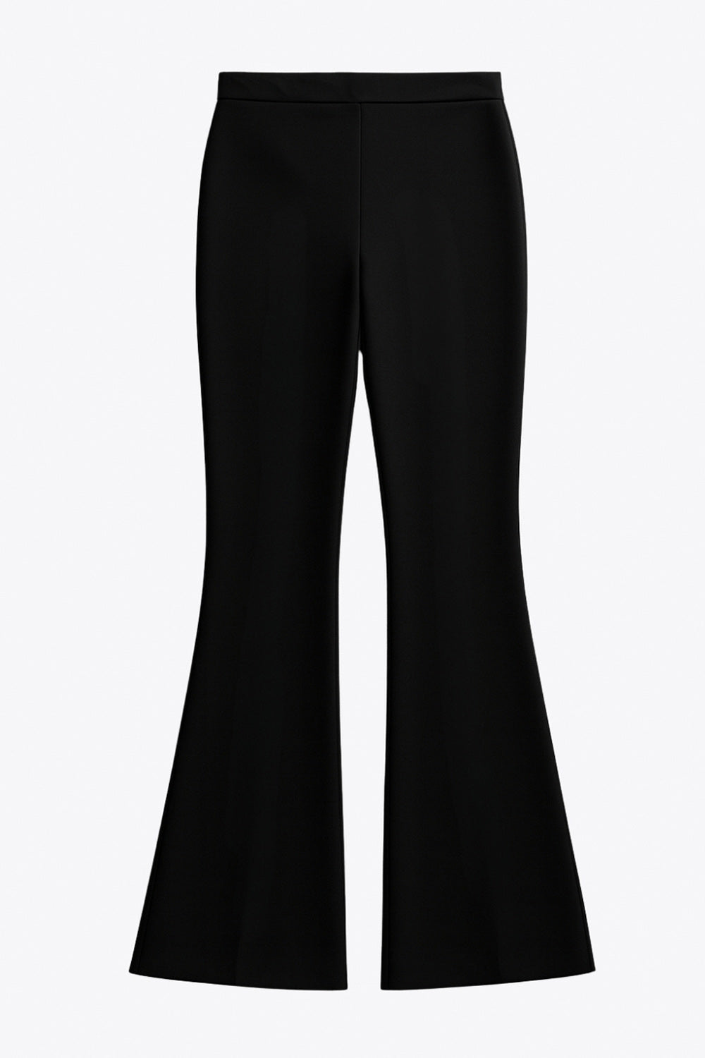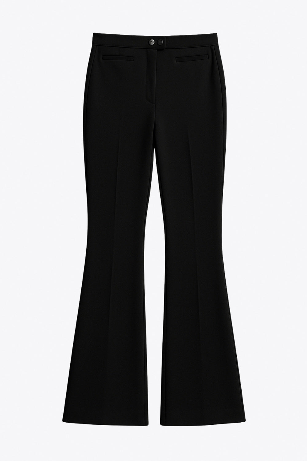 Pantalón ajustado de fit flare, cintura alta con pretina, vivos decorativos frontales, cierre frontal con cremallera oculta y botones.