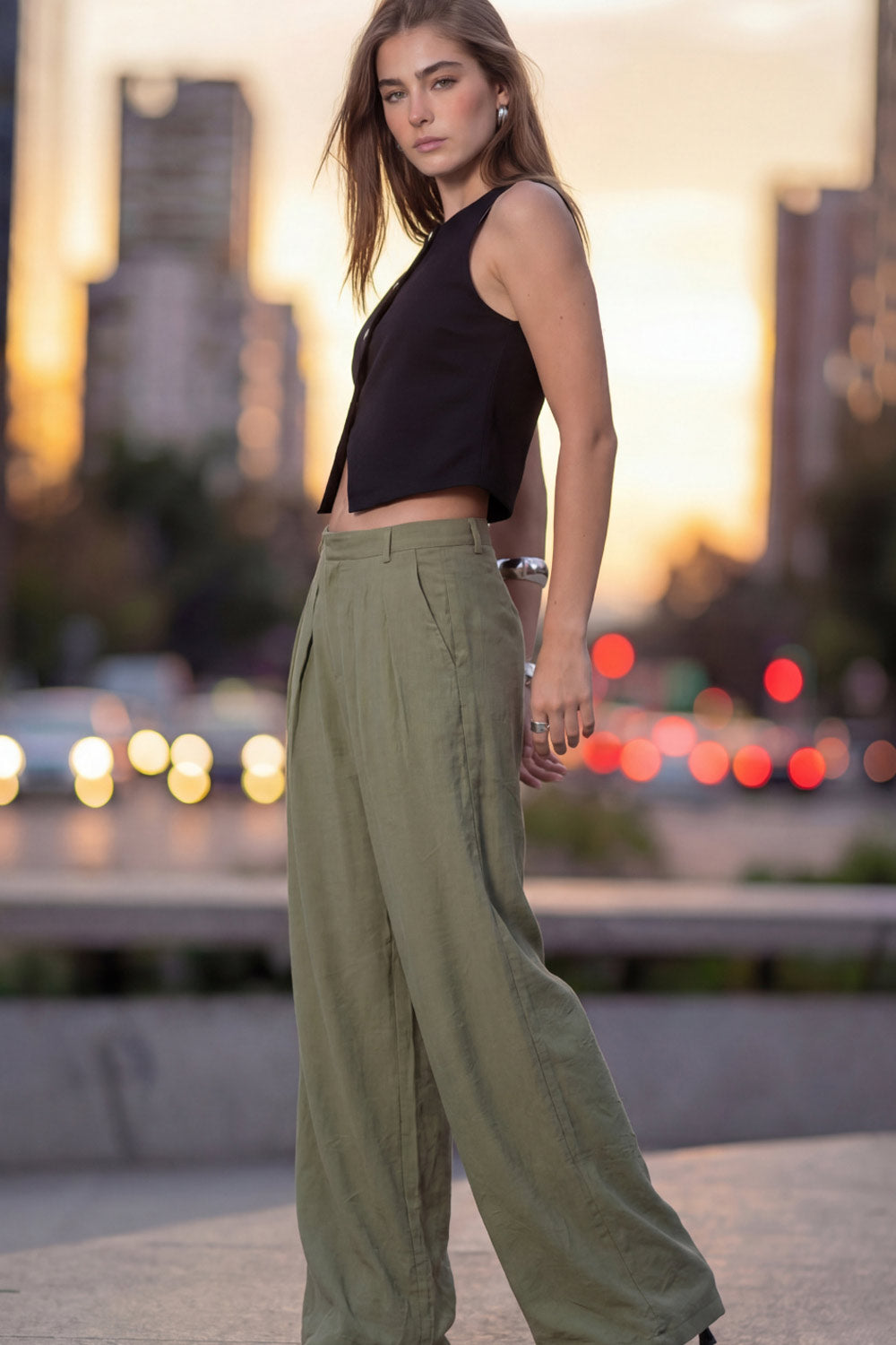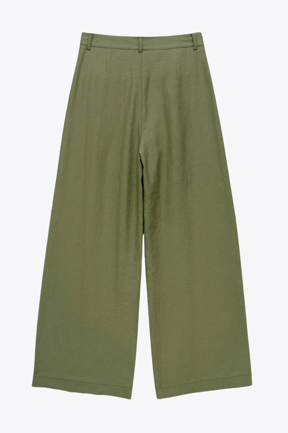 Pantalón de fit wide leg, cintura alta con pretina y trabillas, pinzas frontales, bolsillos delanteros, cierre frontal con broche y cremallera ocultos.