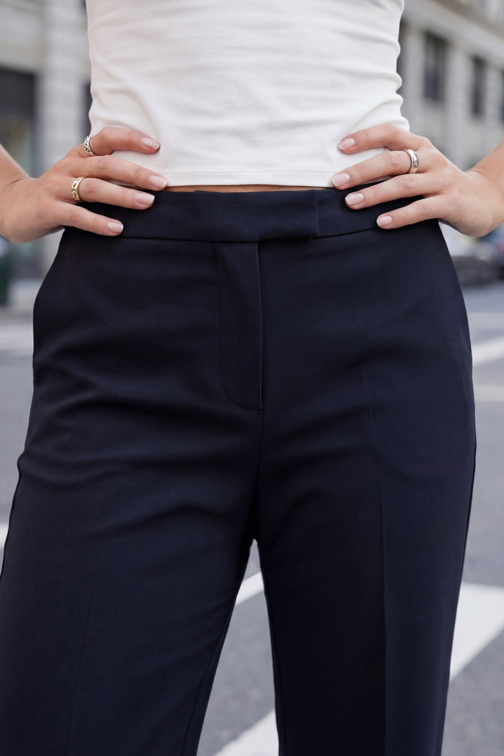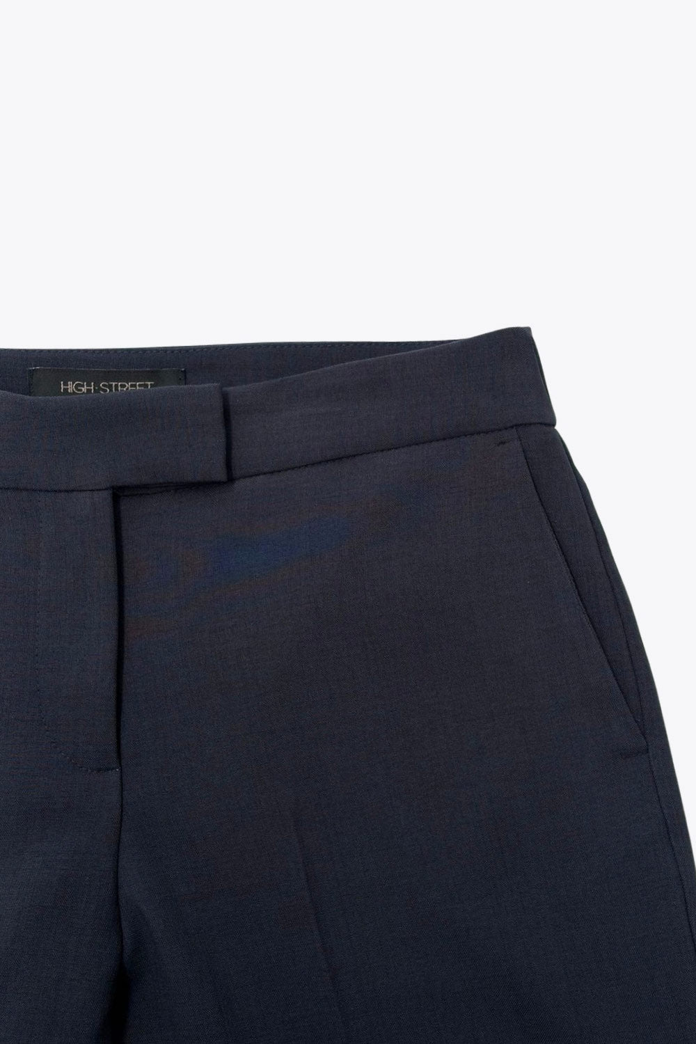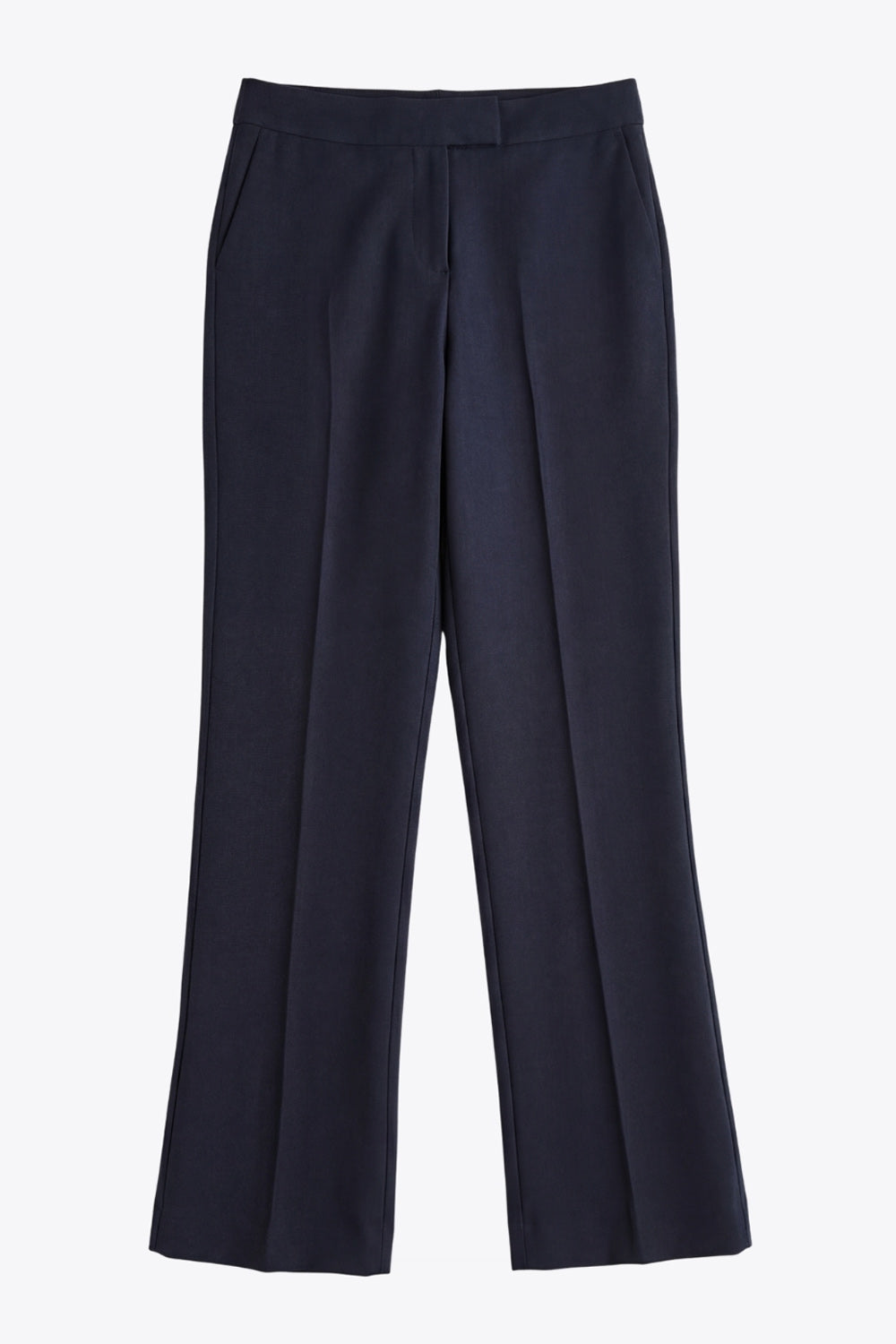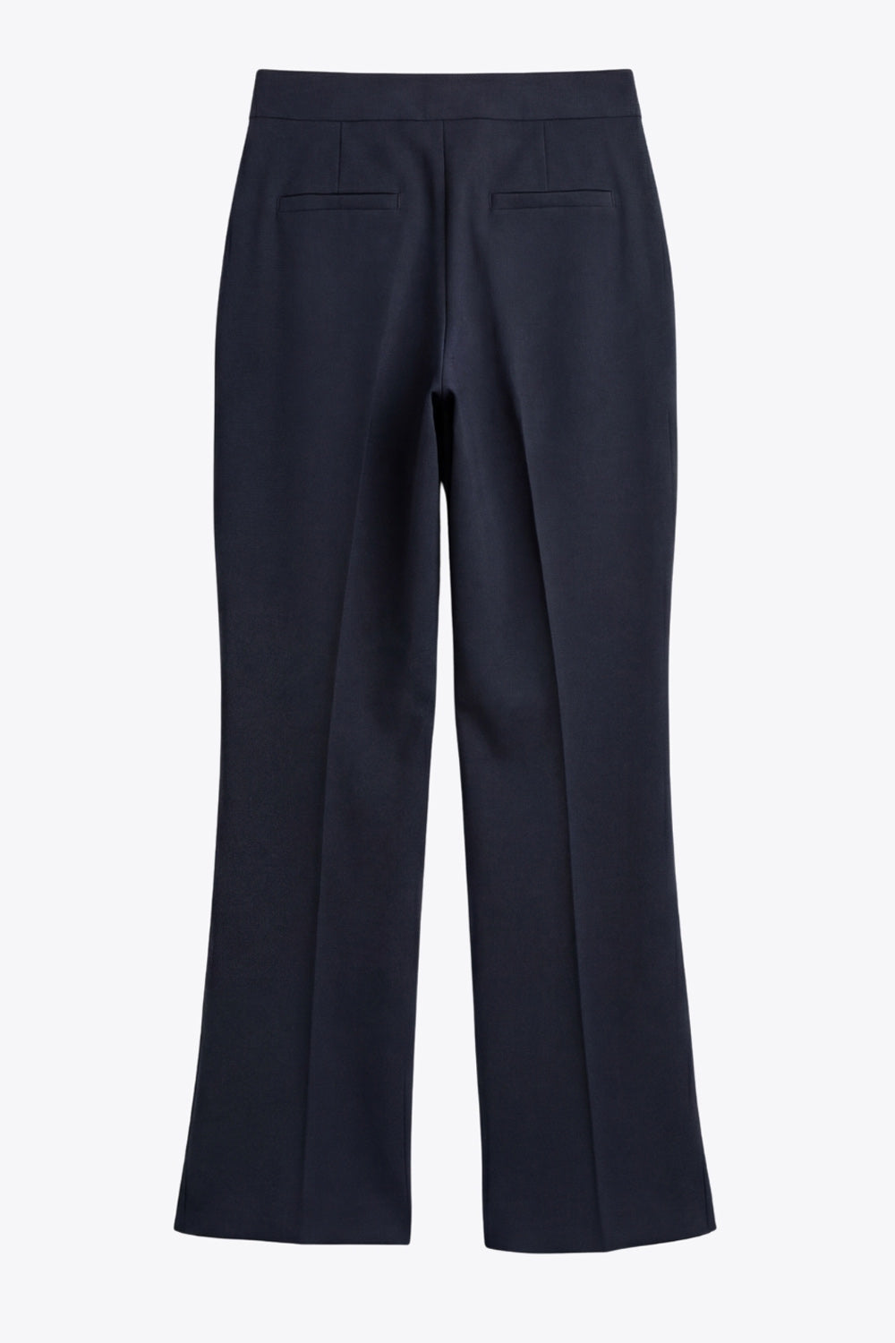 Pantalón ajustado de fit flare, cintura media con pretina, bolsillos delanteros y vivos decorativos posteriores. Cierre frontal con broche y cremallera ocultos.