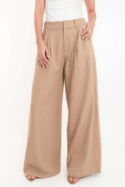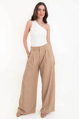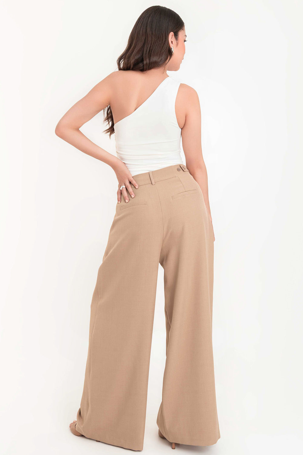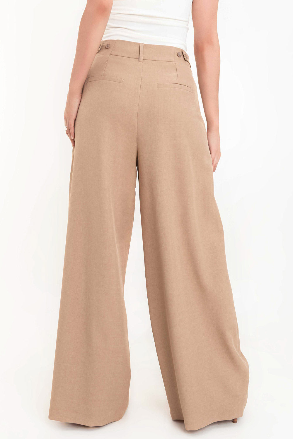 Pantalón de fit wide leg, cintura media con pretina, trabillas ajustables laterales, pinzas frontales, bolsillos delanteros y vivos decorativos posteriores. Cierre frontal con broche y cremallera ocultos.