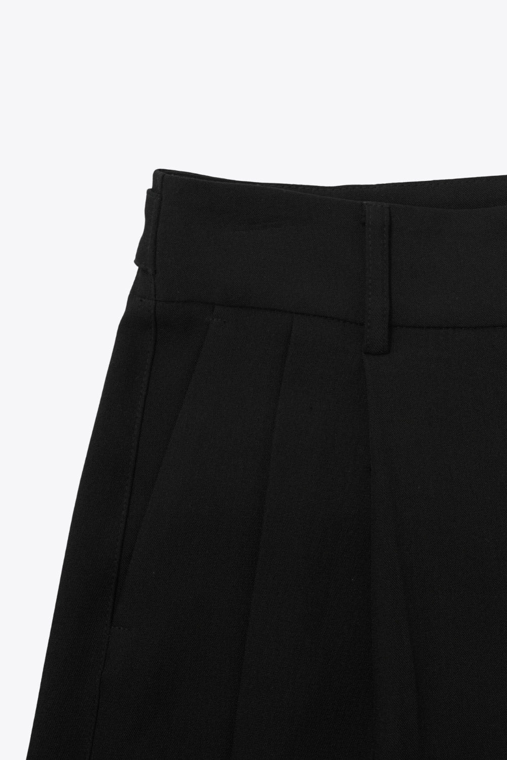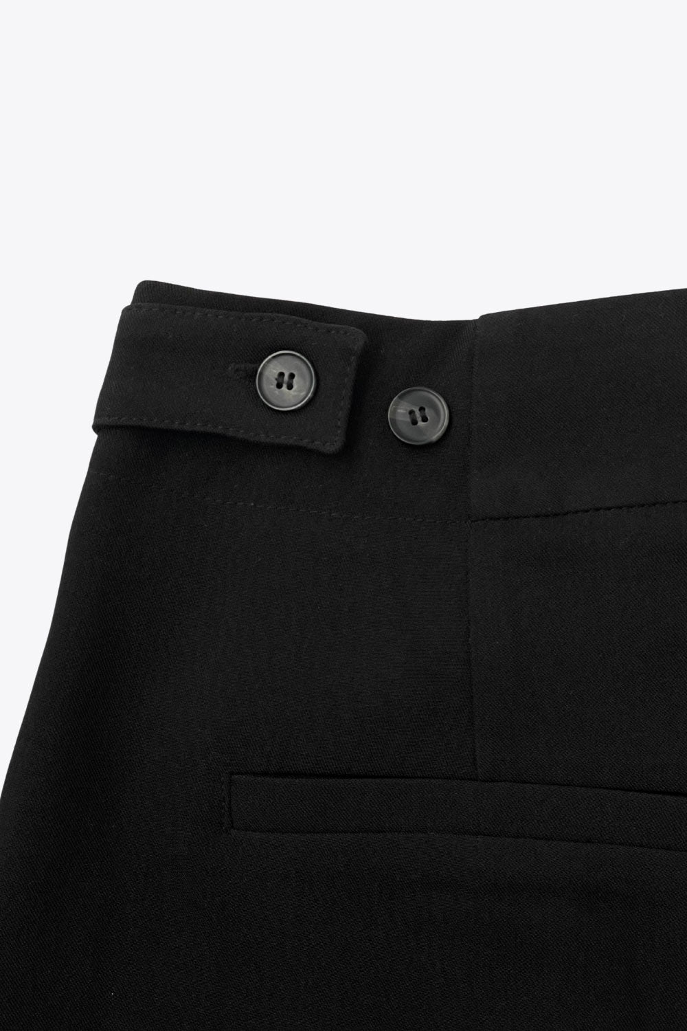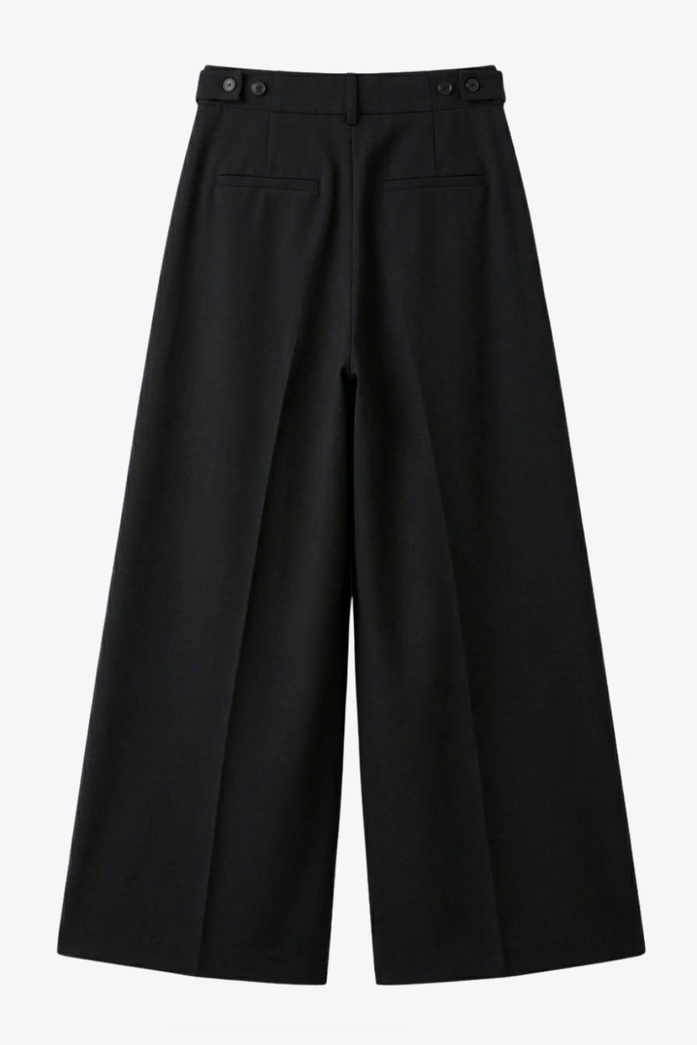 Pantalón de fit wide leg, cintura media con pretina, trabillas ajustables laterales, pinzas frontales, bolsillos delanteros y vivos decorativos posteriores. Cierre frontal con broche y cremallera ocultos.