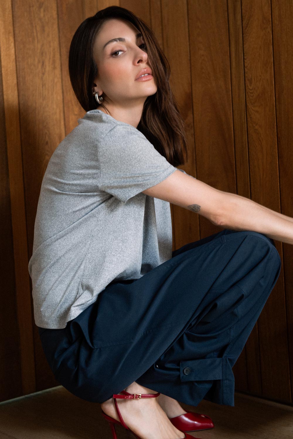 Pantalón de fit wide leg, cintura alta con pretina, bolsillos delanteros y vivos decorativos posteriores, trabillas laterales ajustables en cintura y bajo. Detalle de costuras decorativas frontales, cierre frontal con broche y cremallera ocultos.