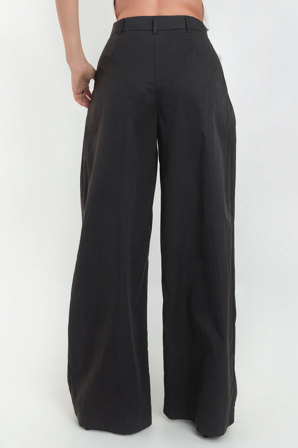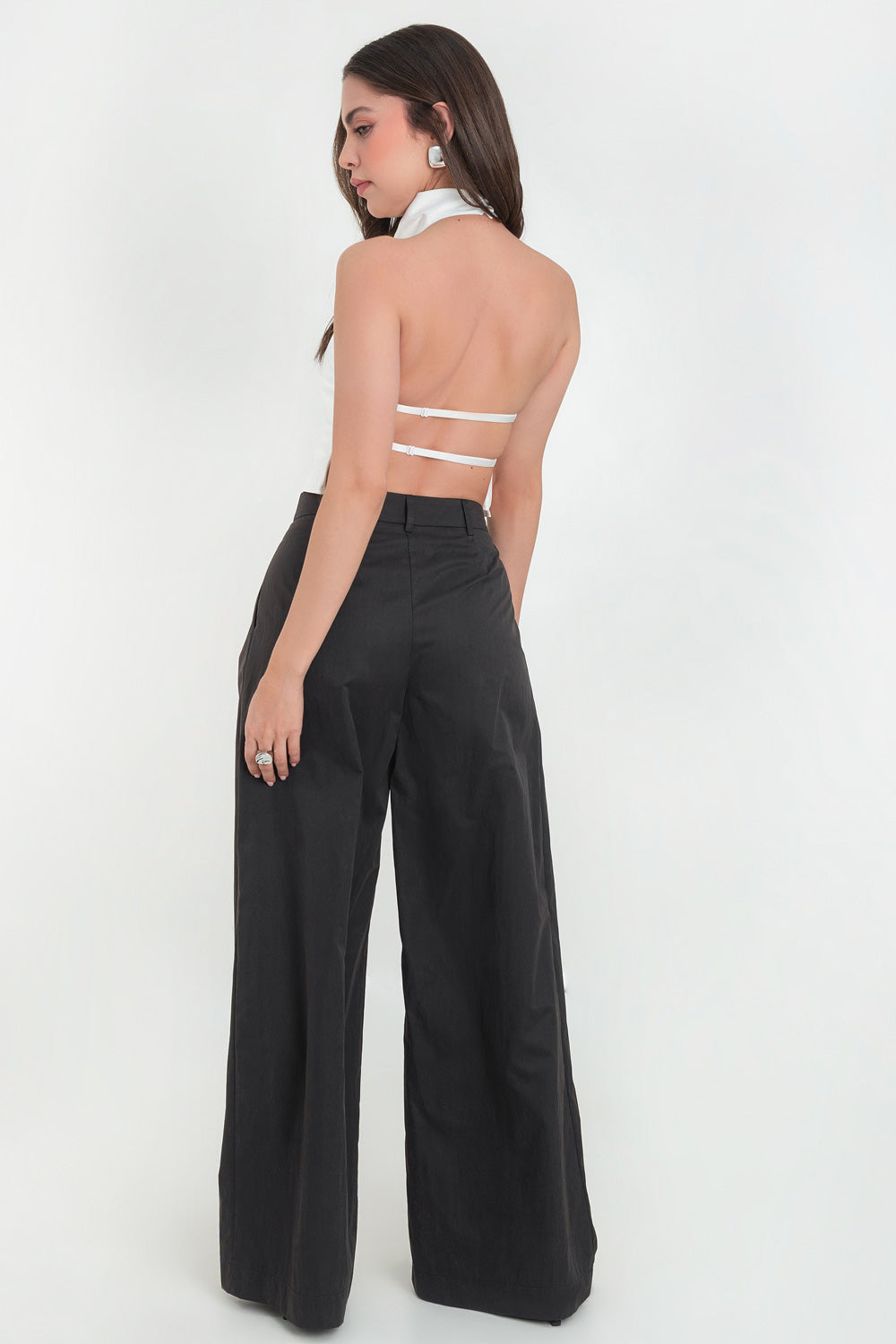 Pantalón de fit wide leg, cintura alta con pretina y trabillas, pinzas frontales, bolsillos delanteros, cierre frontal con botón y cremallera oculta.