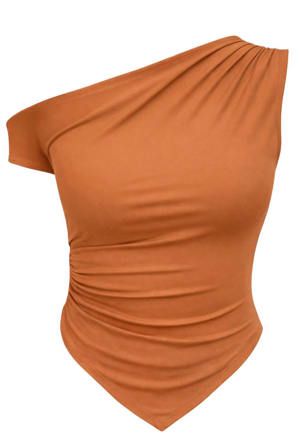 Top ajustado sin mangas, de cuello diagonal con hombro descubierto, plisados en hombros y bajo frontal asimétrico.