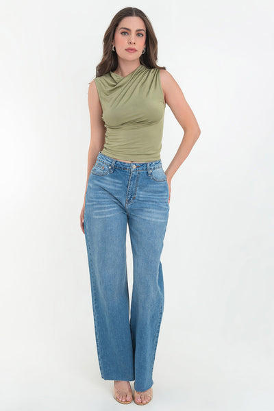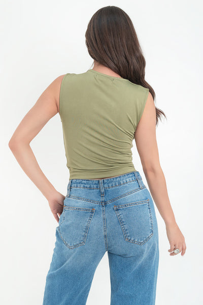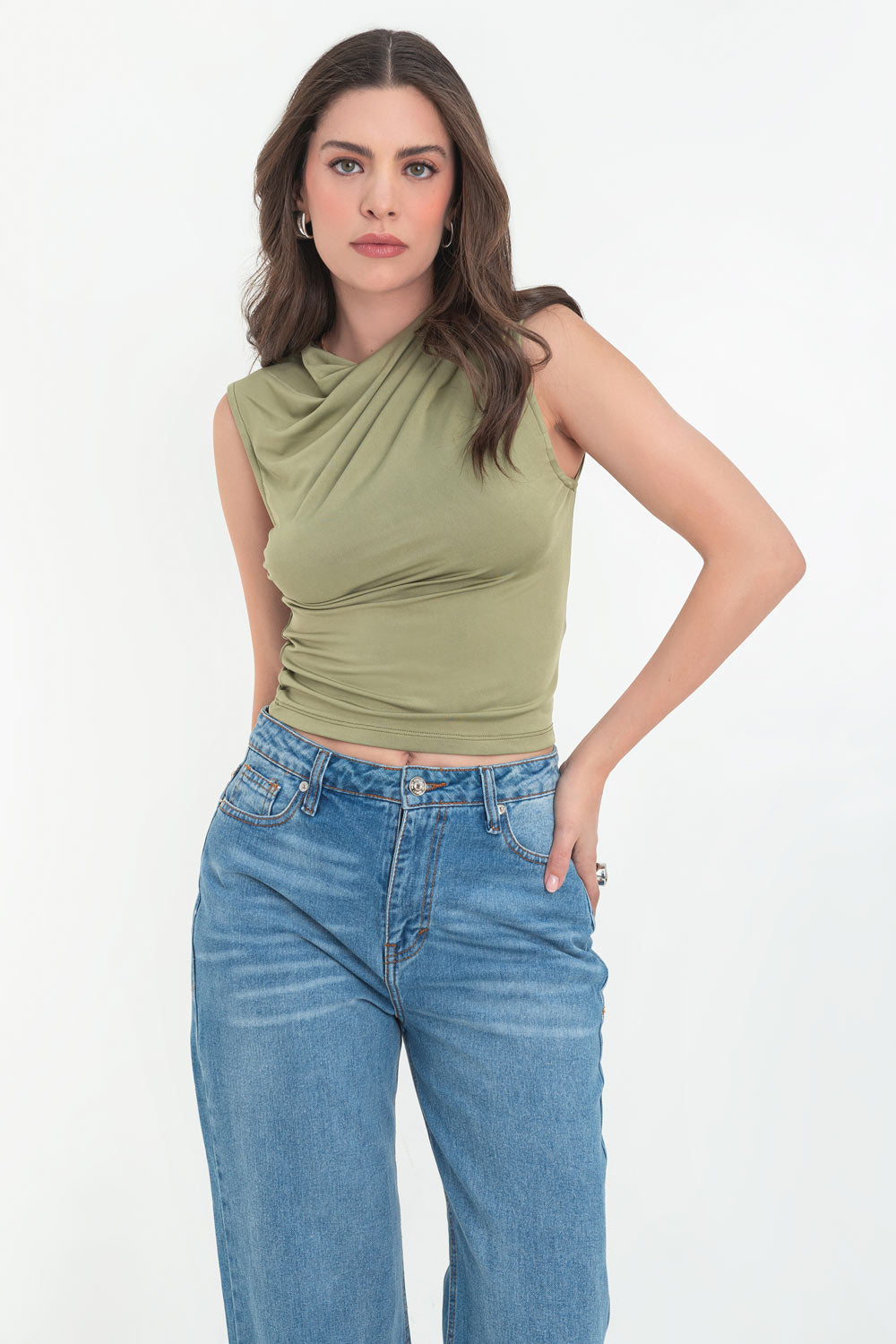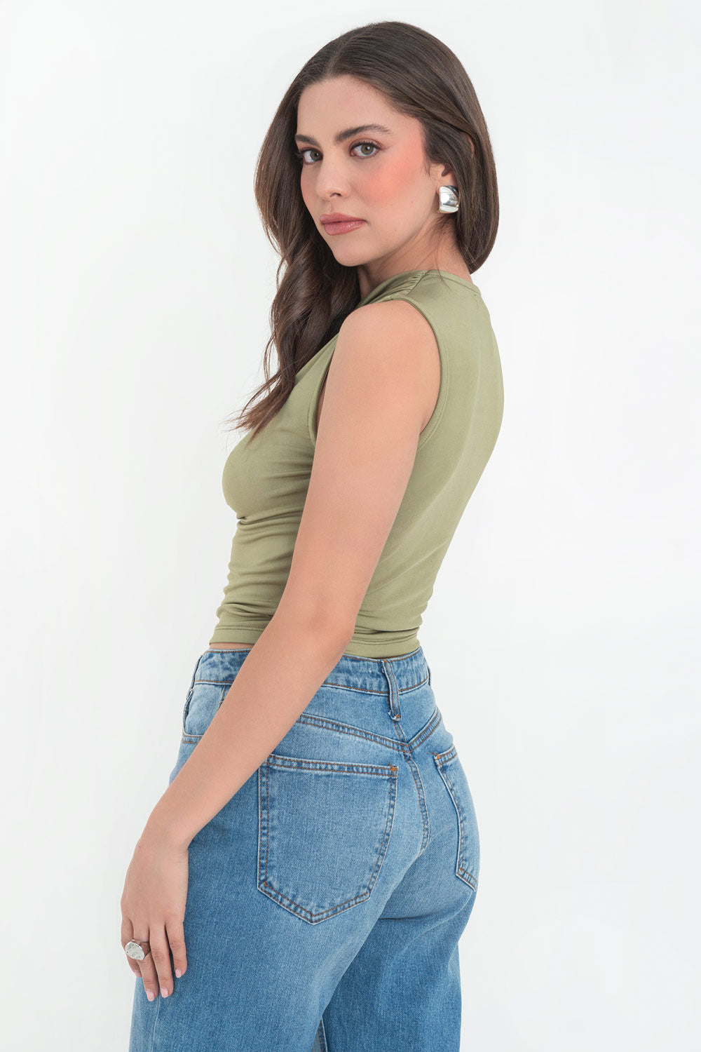 Top de fit ajustado, sin mangas, cuello fluido y plisados decorativos en hombros.