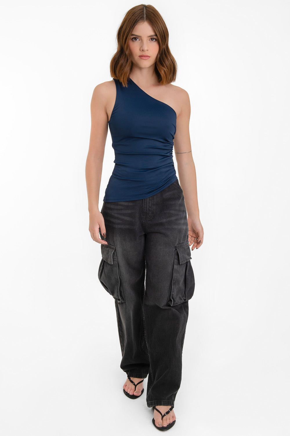 Top asimétrico de fit ajustado, un hombro, escote diagonal, plisados en costado y detalle de bajo asimétrico curveado.