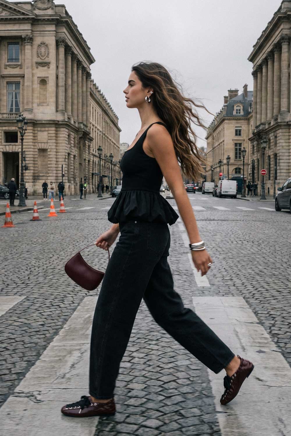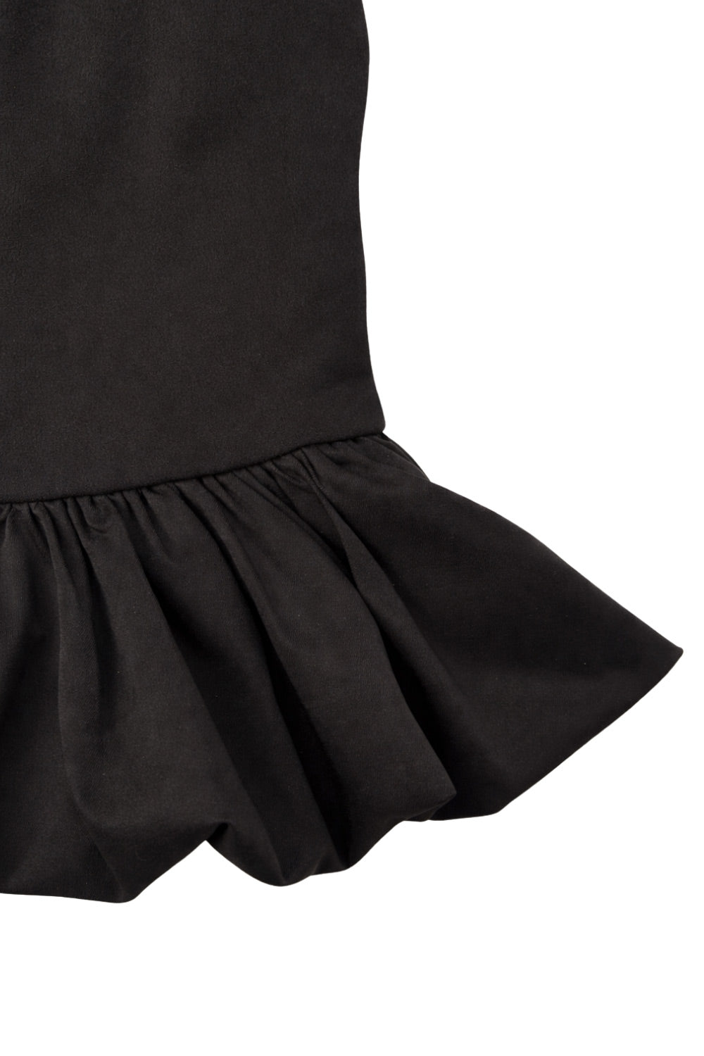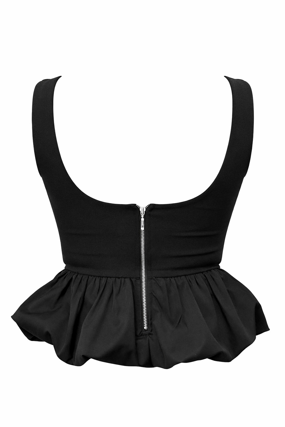 Top corto con peplum globo, fit ajustado, sin mangas, escote cuadrado, plisados con rib elástico en cintura y bajo con acabado en volumen. Cierre posterior con cremallera visible en contraste.