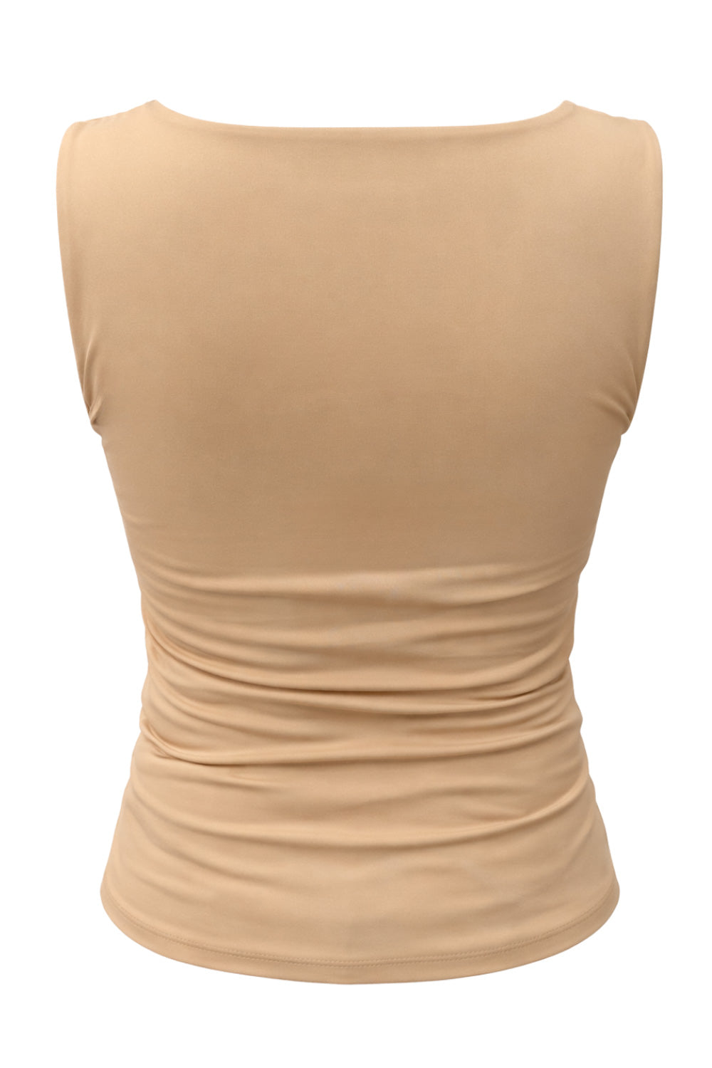 Top básico de fit ajustado, cuello barco, sin mangas, plisados en costados y hombros.