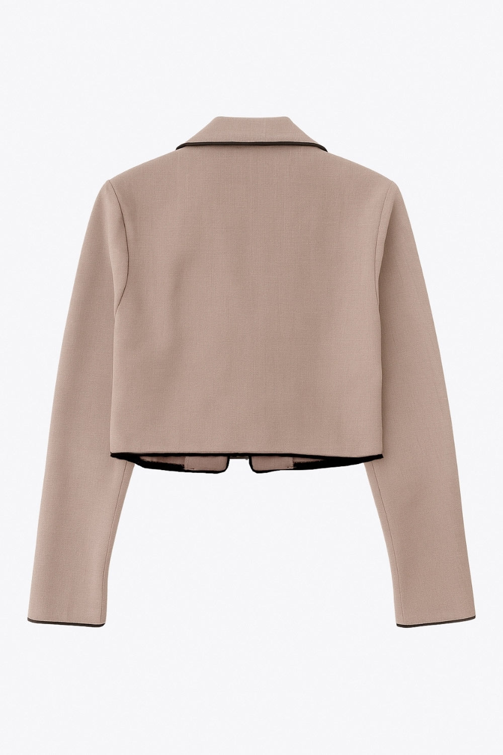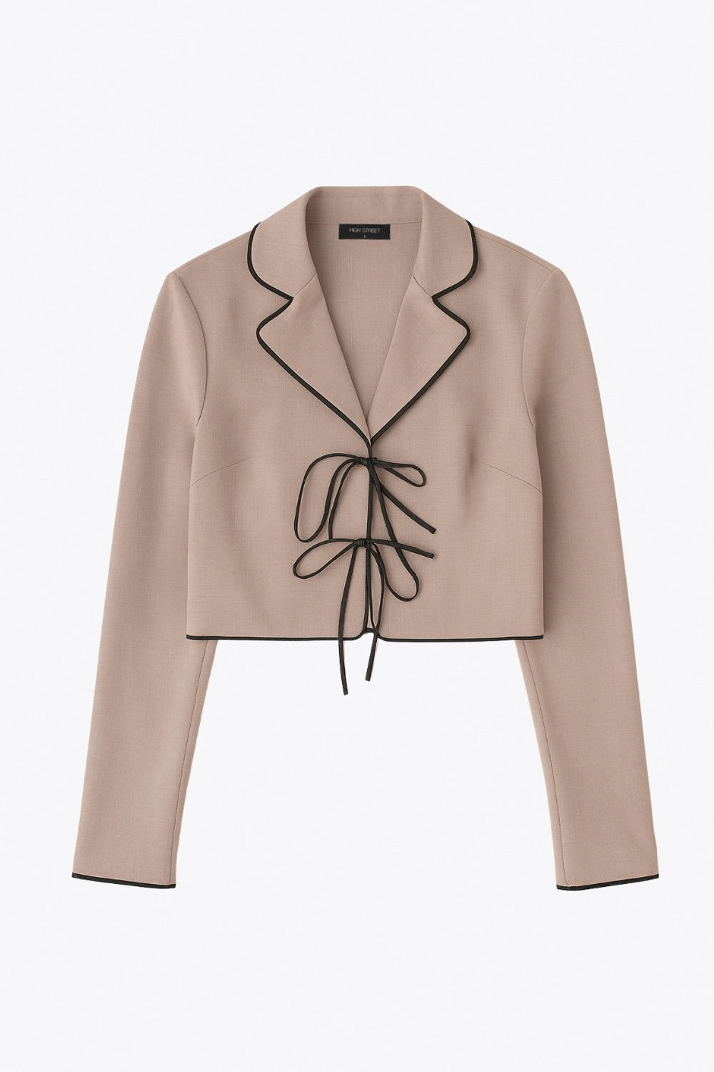 Top blazer corto de fit fluido, manga larga, escote v con solapa y cierre frontal con lazos amarrables. Detalle de ribete decorativo en contraste.