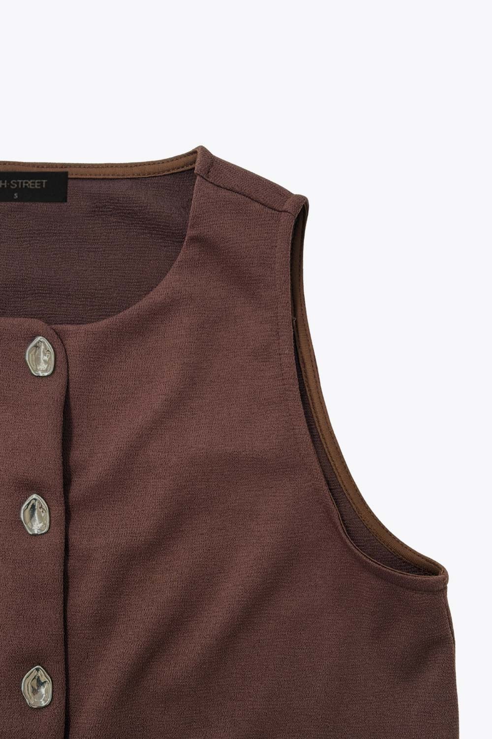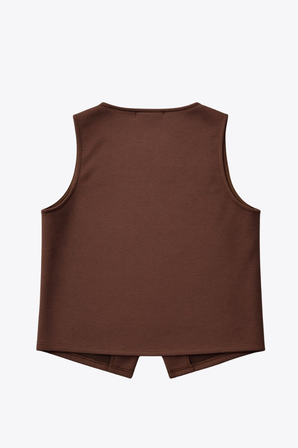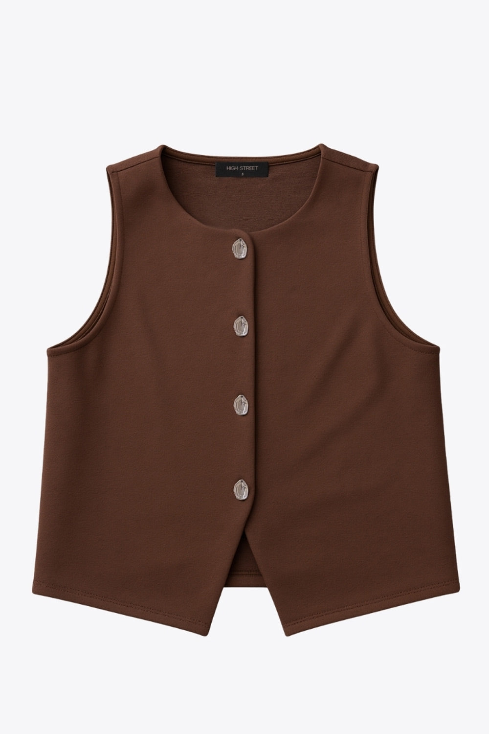 Chaleco corto de fit recto, cuello redondo y cierre frontal con hilera de botones en contraste. Detalle abertura v en bajo.