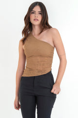 Top corto asimétrico de mesh, fit ajustado, un hombro, escote diagonal, sin mangas, detalles plisados en costado y bajo asimétrico con rib en borde.