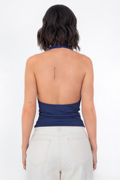 Top corto ajustado de cuello halter con escote fluido, sin mangas, escote en espalda, cierre posterior con botón y ojal.