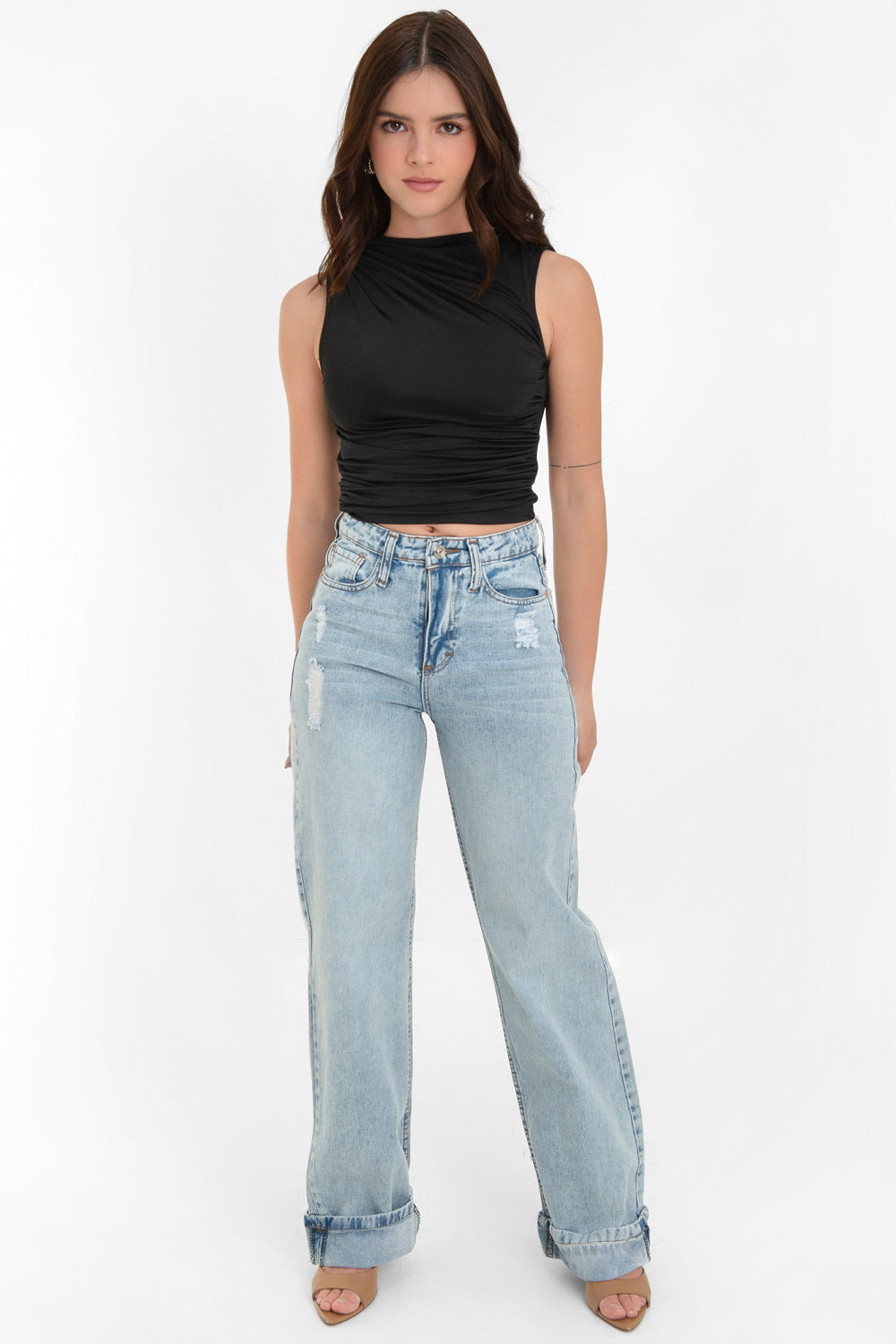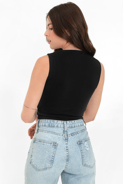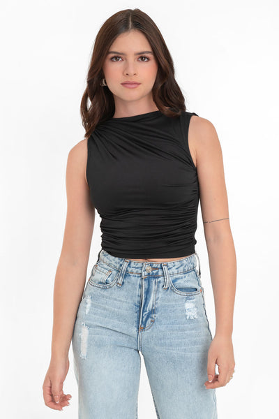Top corto de fit ajustado, sin mangas, cuello barco, plisados decorativos en hombro y costados.