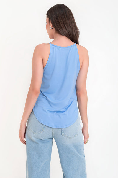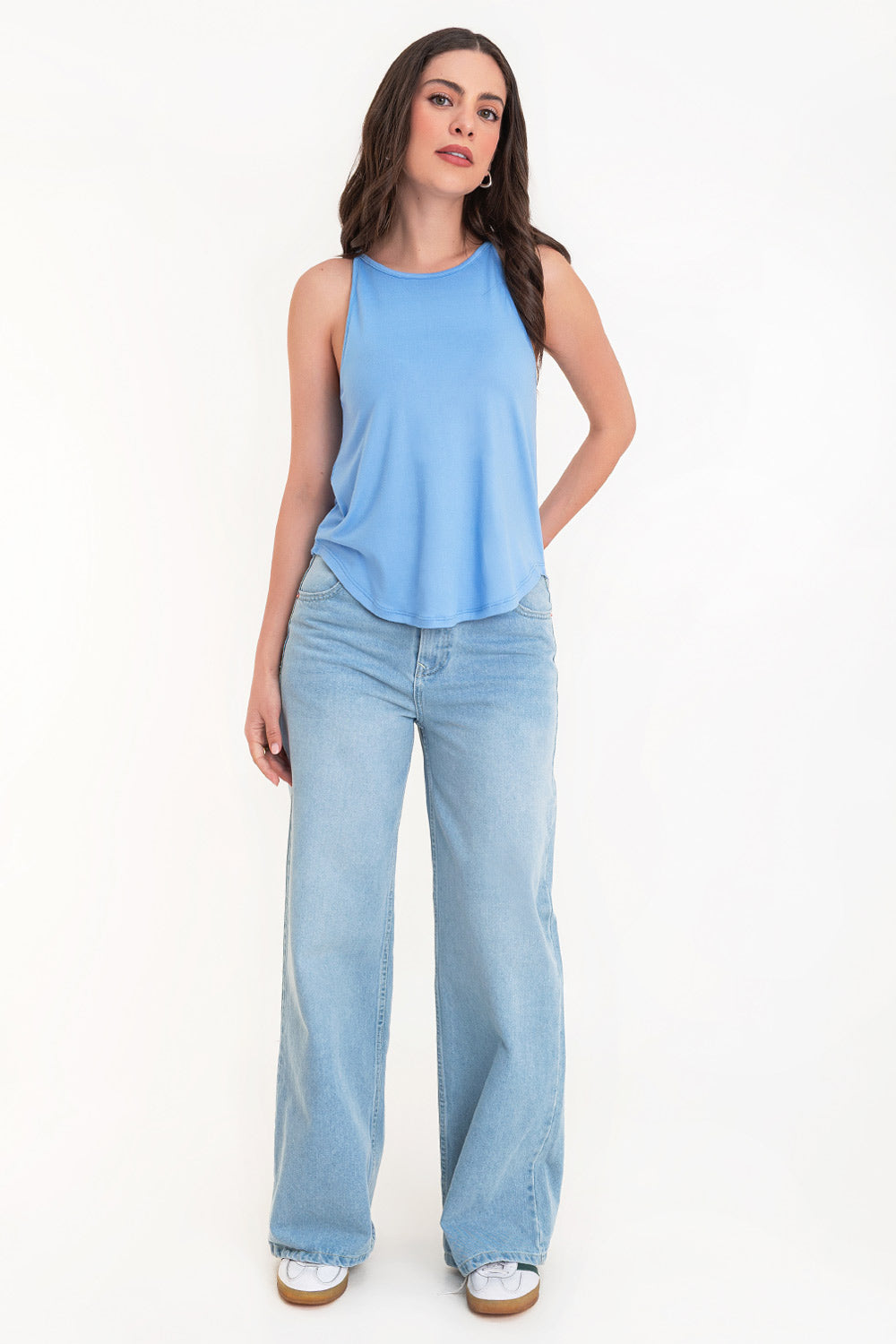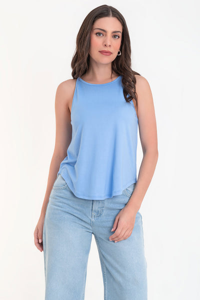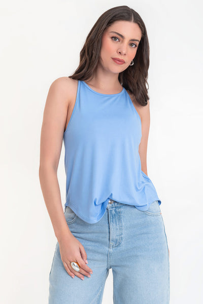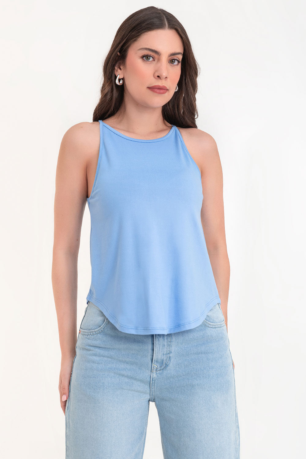 Top de cuello halter sin mangas, tirantes finos, bajo curveado y silueta ligeramente oversized.