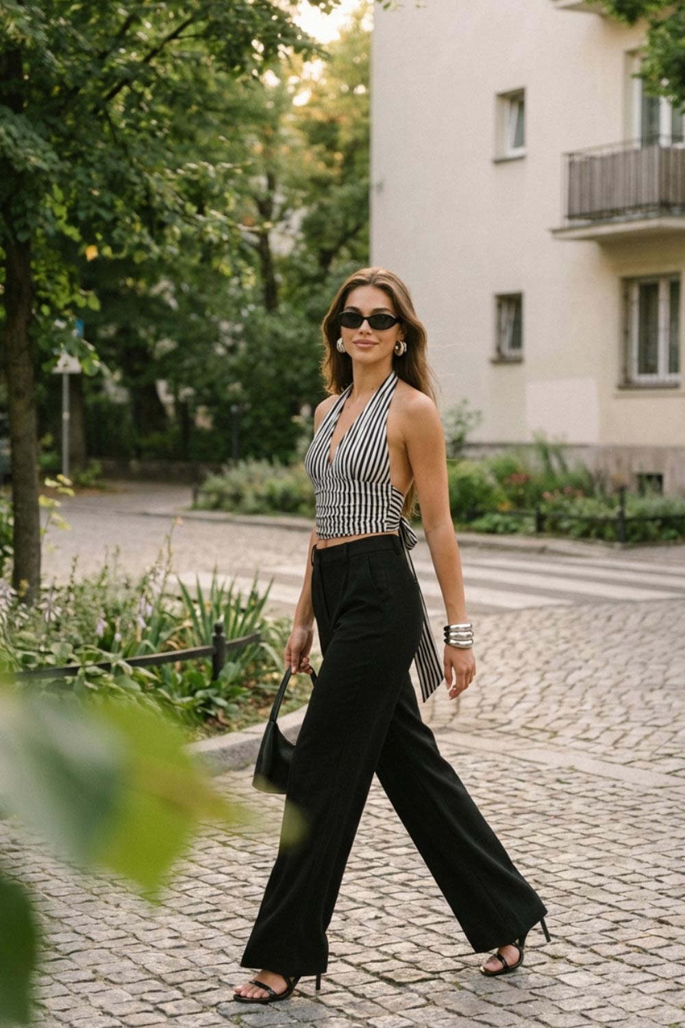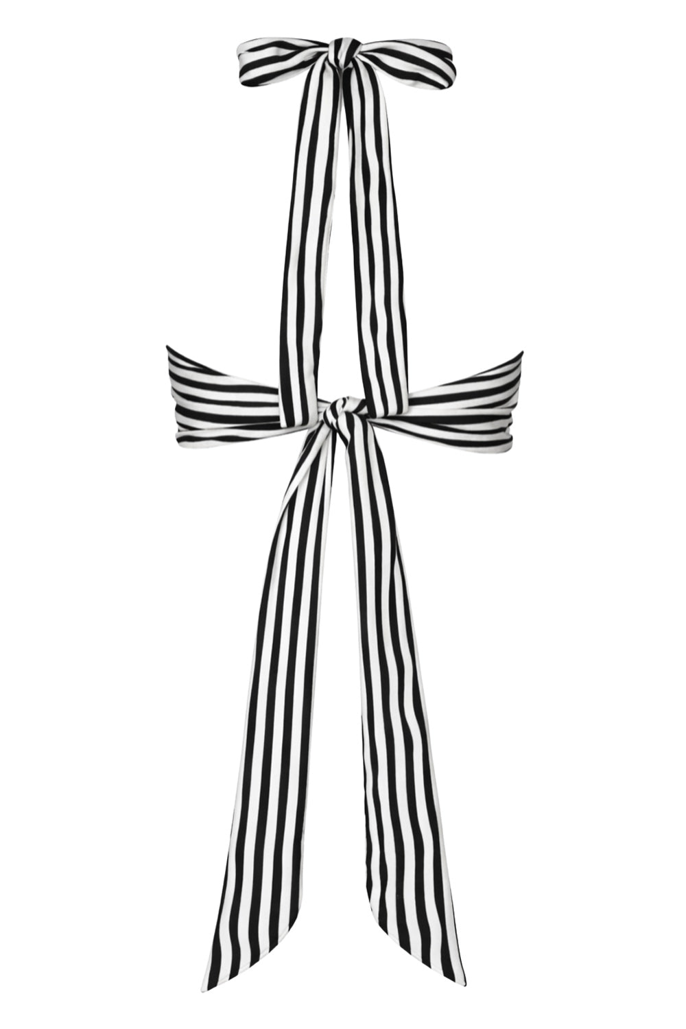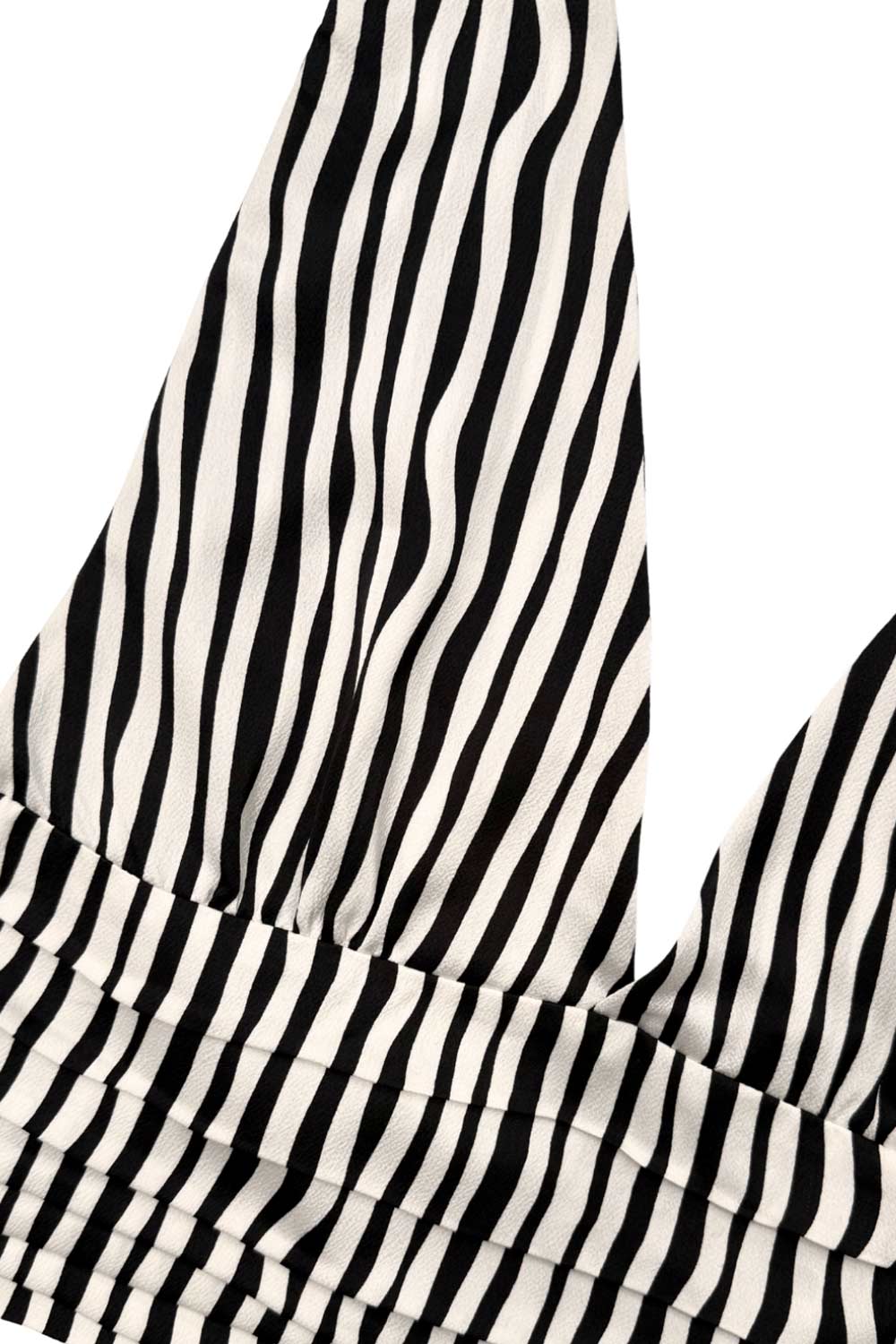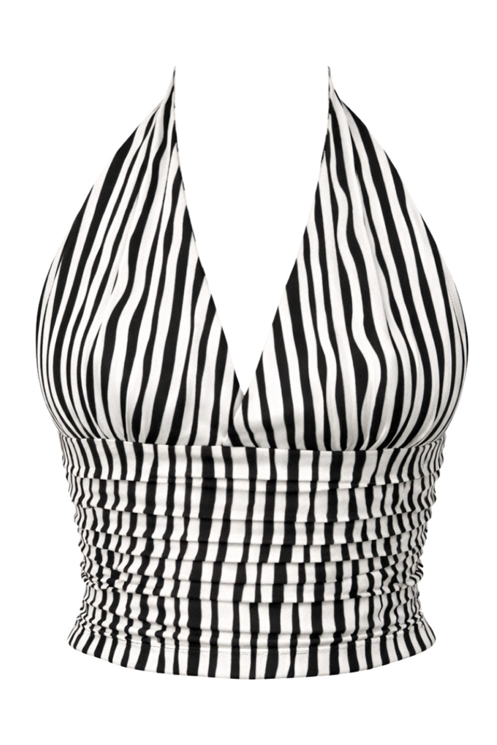 Top corto de estampado rayas, cuello halter con nudo amarrable posterior, escote v y plisados en cintura, fit ajustado, escote en espalda y cierre posterior con nudo amarrable.