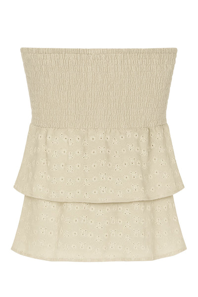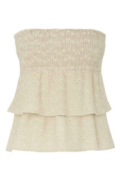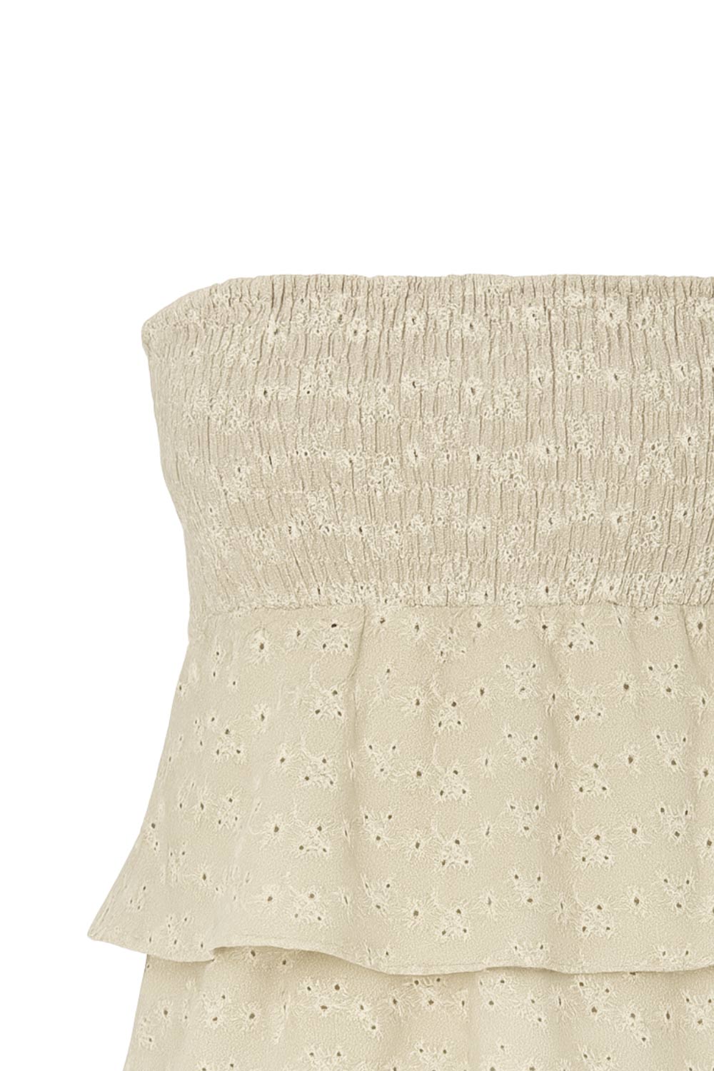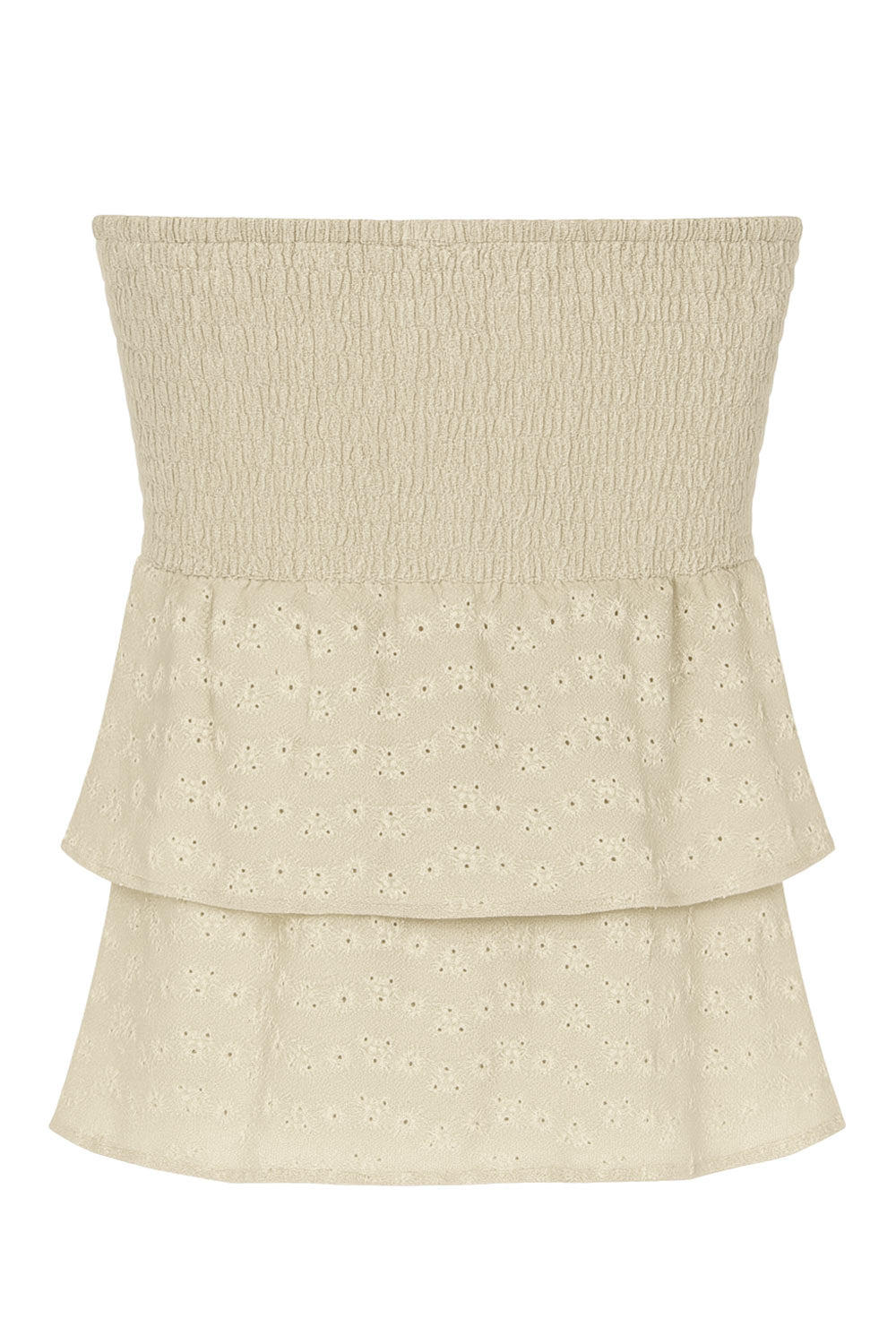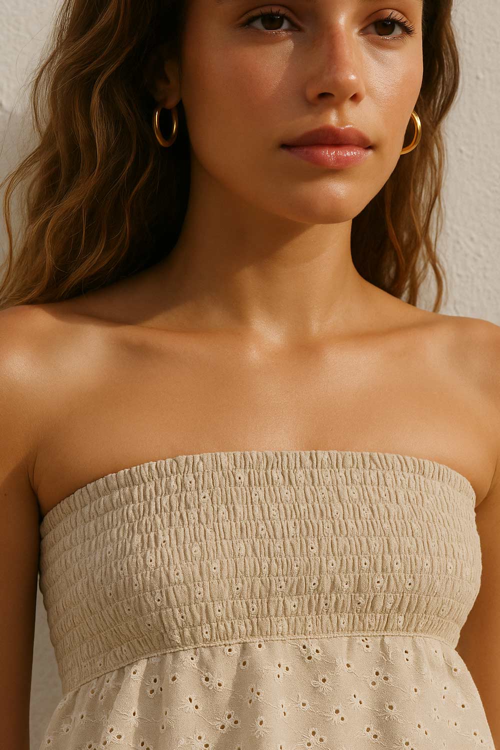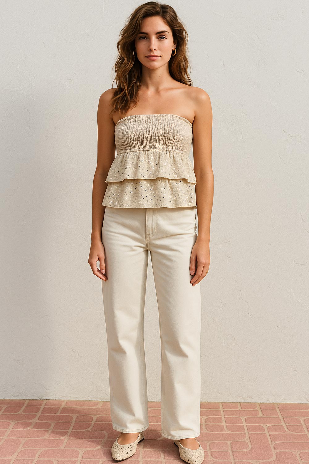 Top strapless de fit ajustado, escote recto con fruncido y peplum con capas de olanes en bajo. Detalle de bordado con perforado en tejido.