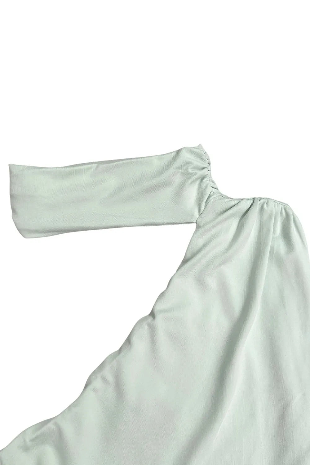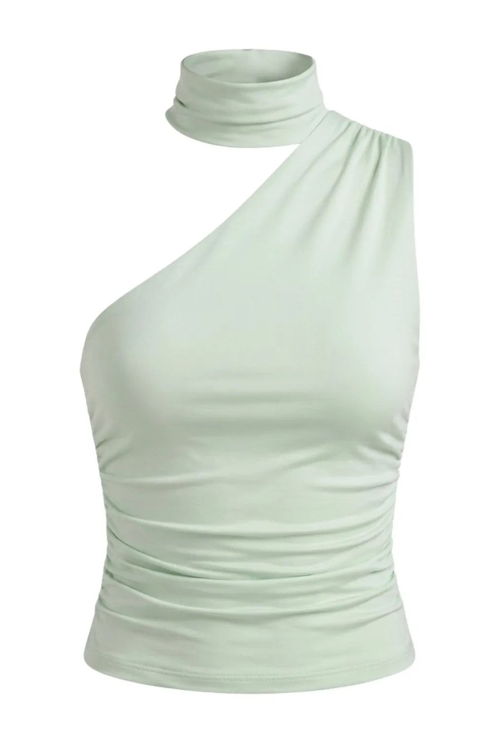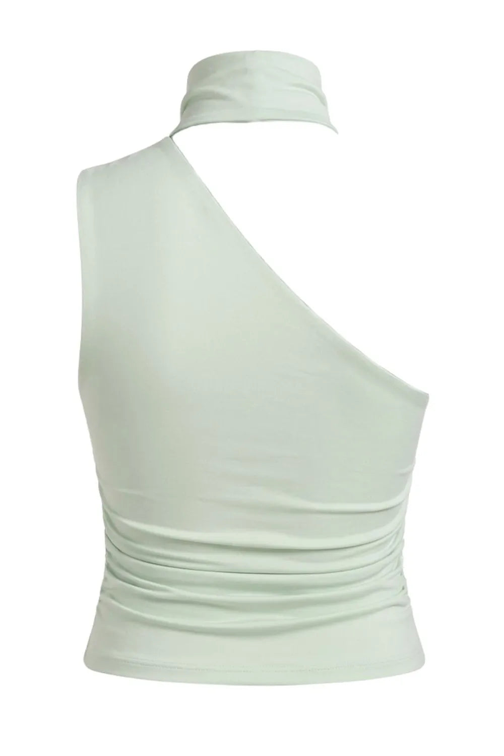 Top satinado asimétrico, de fit ajustado, detalles plisados laterales y en hombro, sin mangas, un hombro, escote diagonal y choker con plisados. Cierre posterior con botón y ojal.