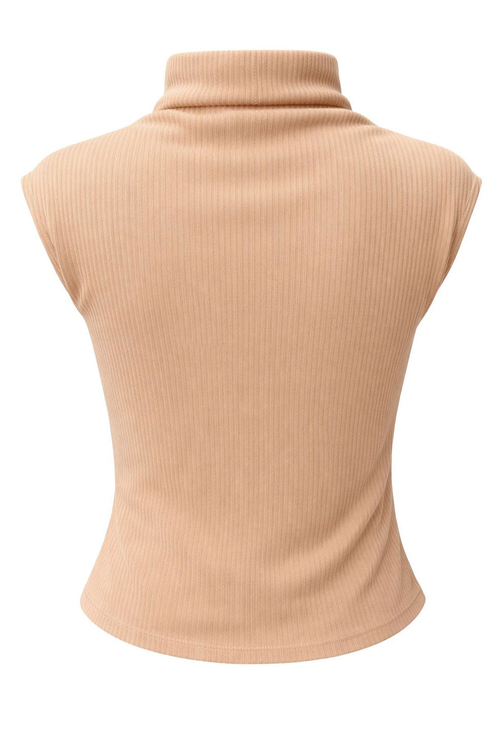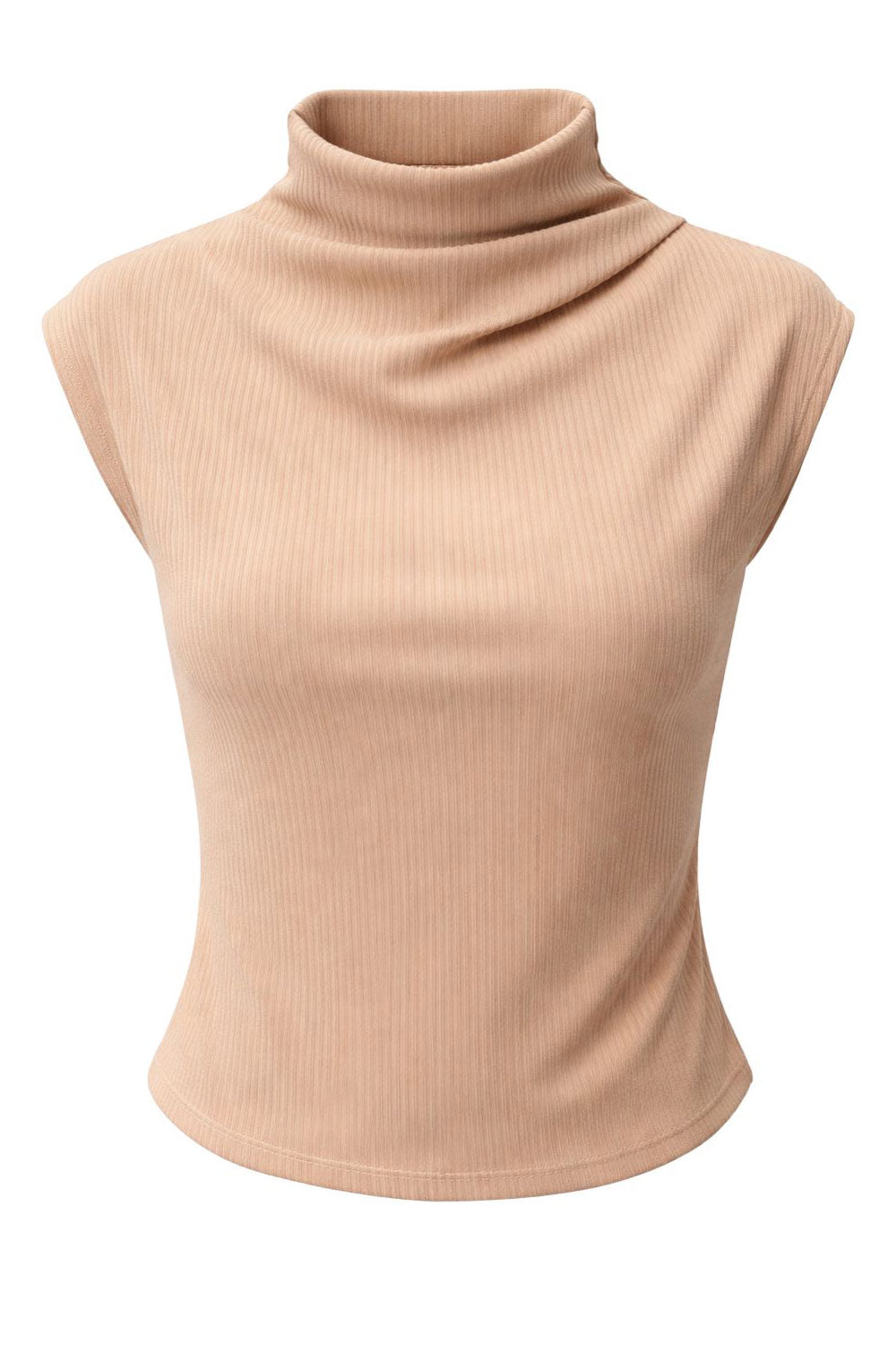 Top canalé de fit ajustado, cuello alto fluido con plisados en hombro y manga corta seguida.