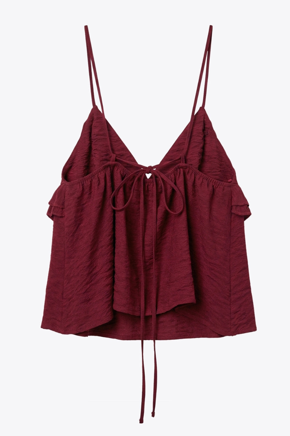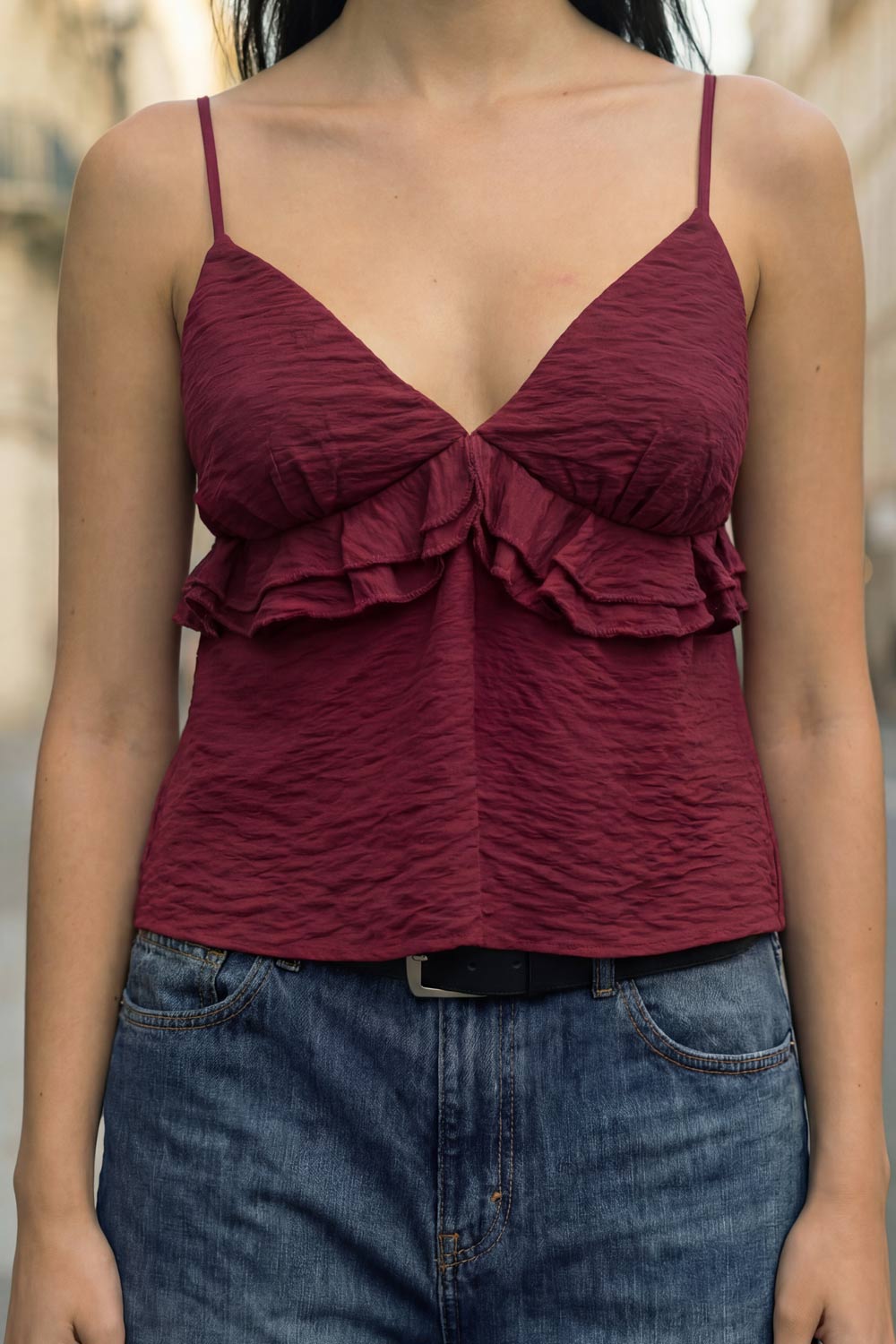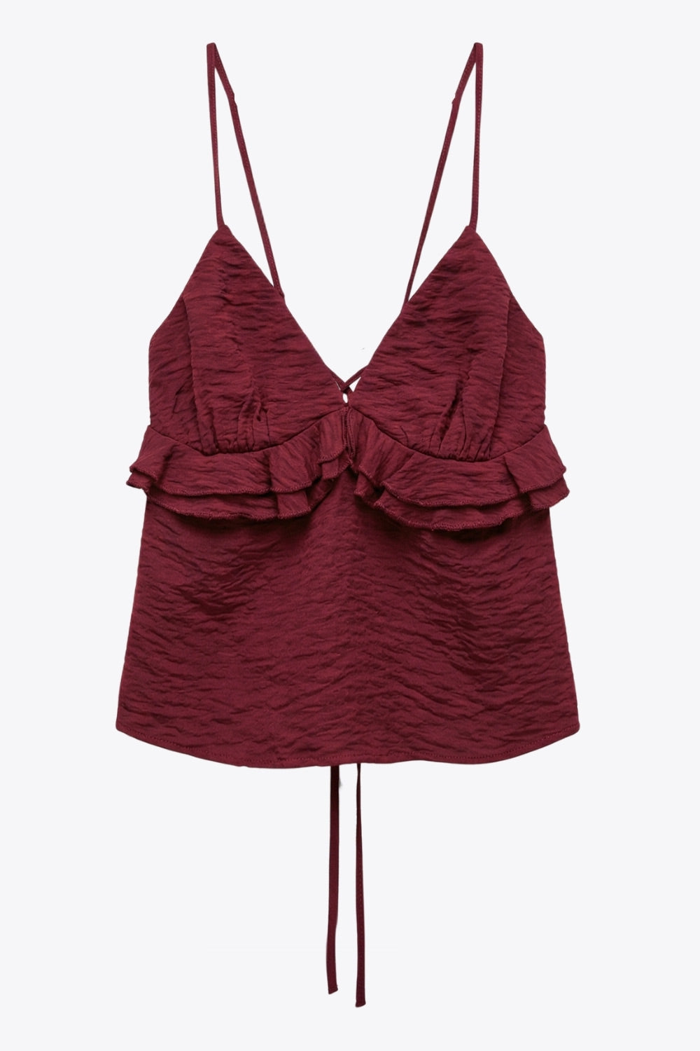 Top corto de fit recto, tirantes delgados con jareta ajustable posterior, escote v con cortes, plisados y olanes decorativos frontales. Detalle de rib elástico posterior.