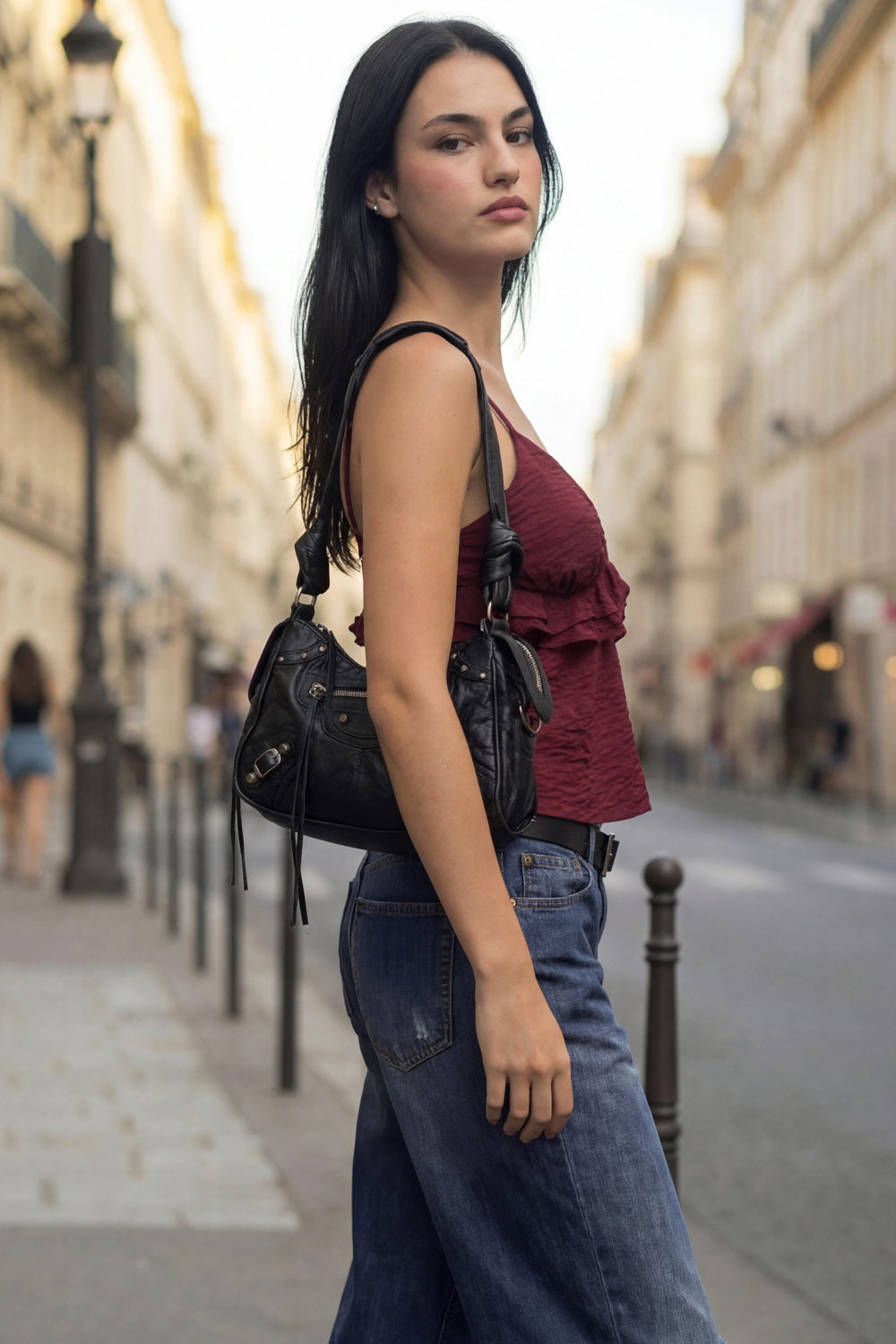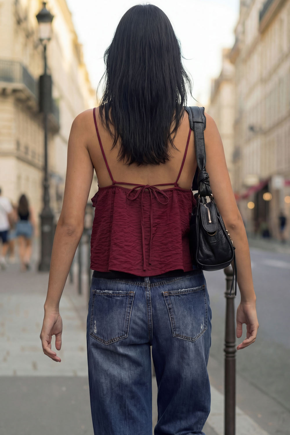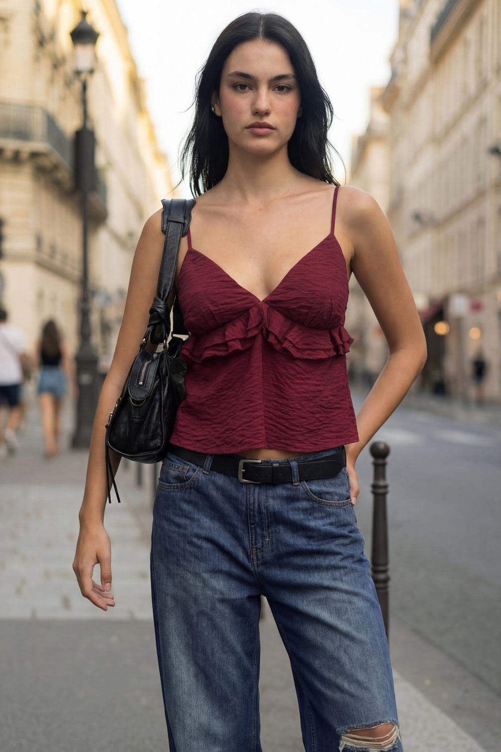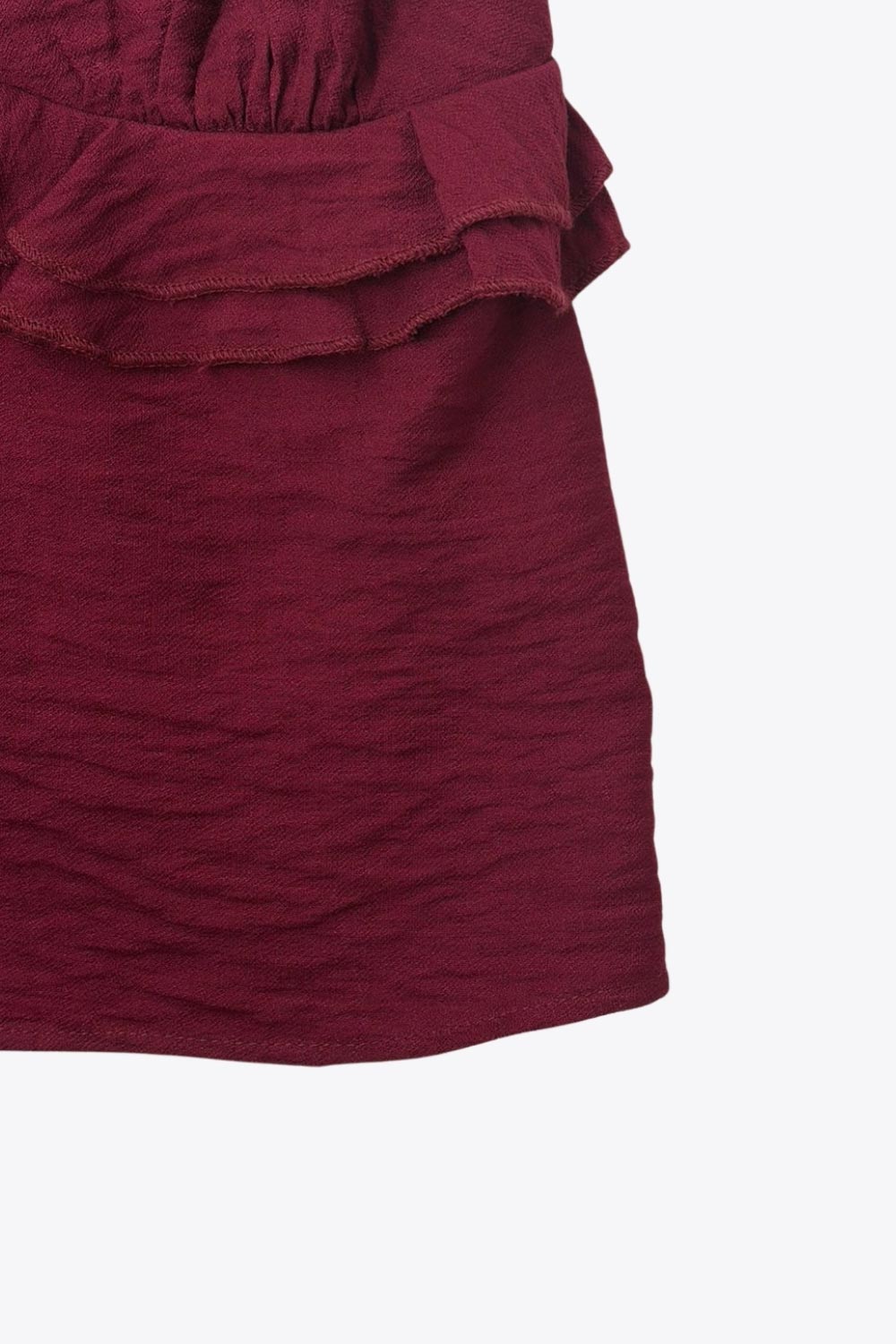 Top corto de fit recto, tirantes delgados con jareta ajustable posterior, escote v con cortes, plisados y olanes decorativos frontales. Detalle de rib elástico posterior.