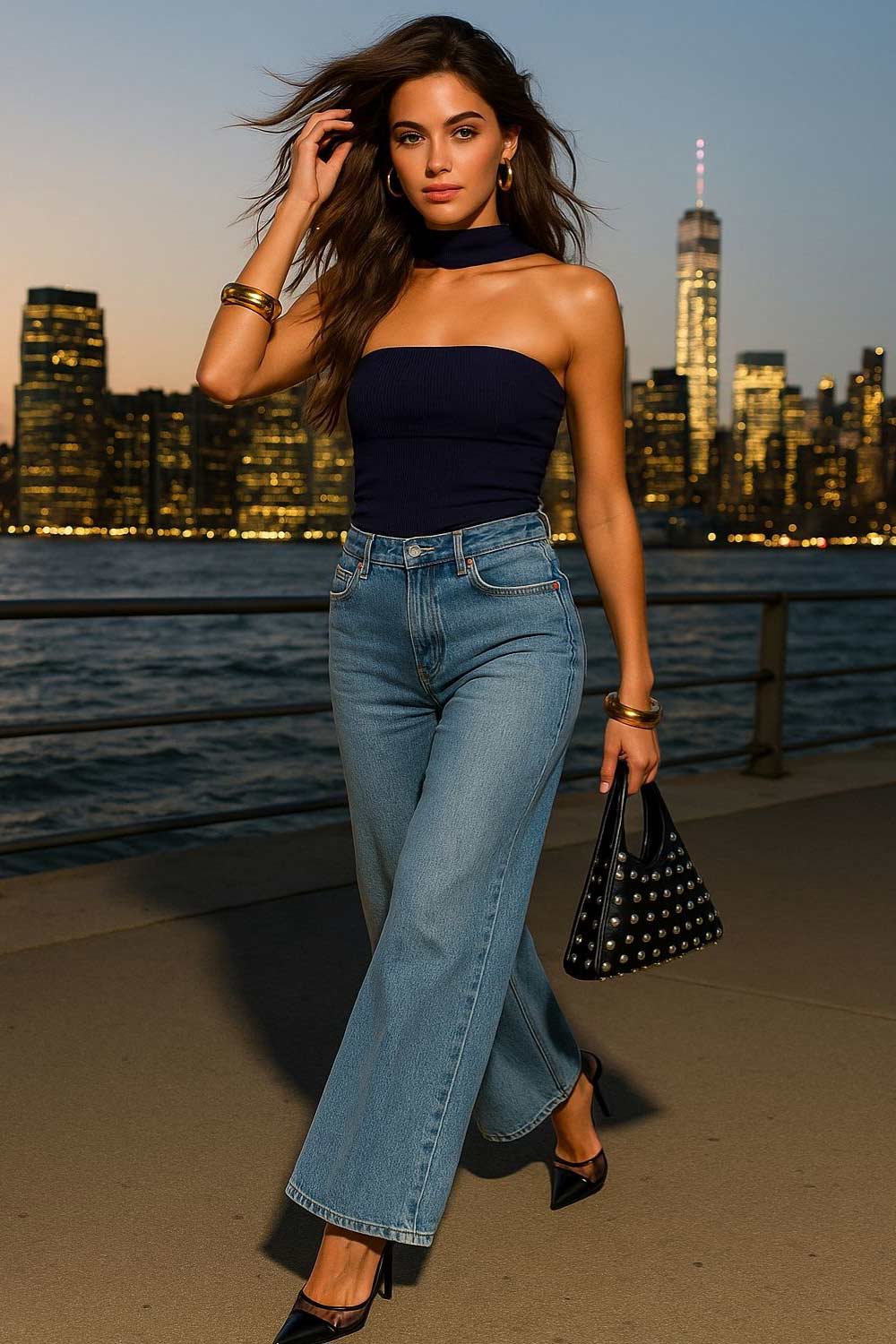 Top tubo canalé de fit ajustado, escote recto y detalle decorativo posterior de choker.