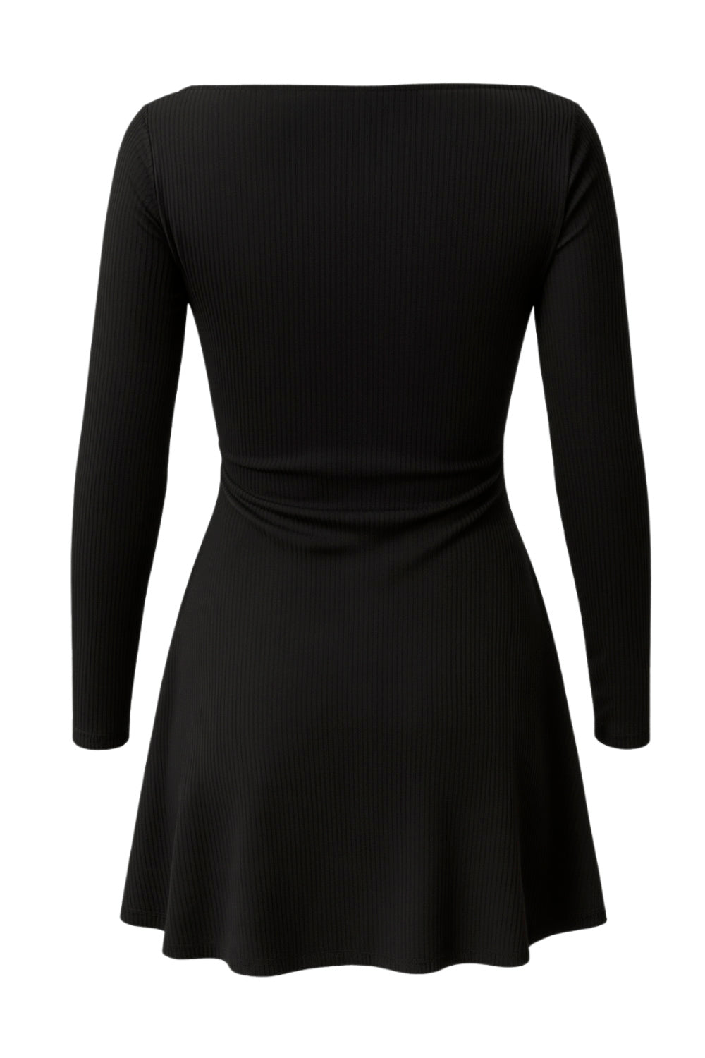Vestido corto canalé de fit ajustado, manga larga, cuello barco, plisados laterales en cintura y corte en a.