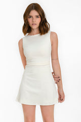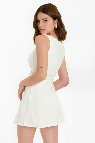 Vestido corto básico canalé, de corte en a, cuello barco, sin mangas y detalles plisados en costado.