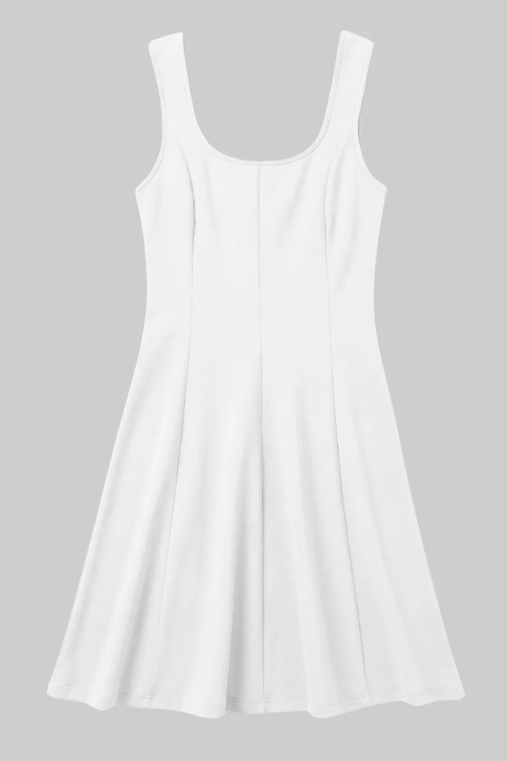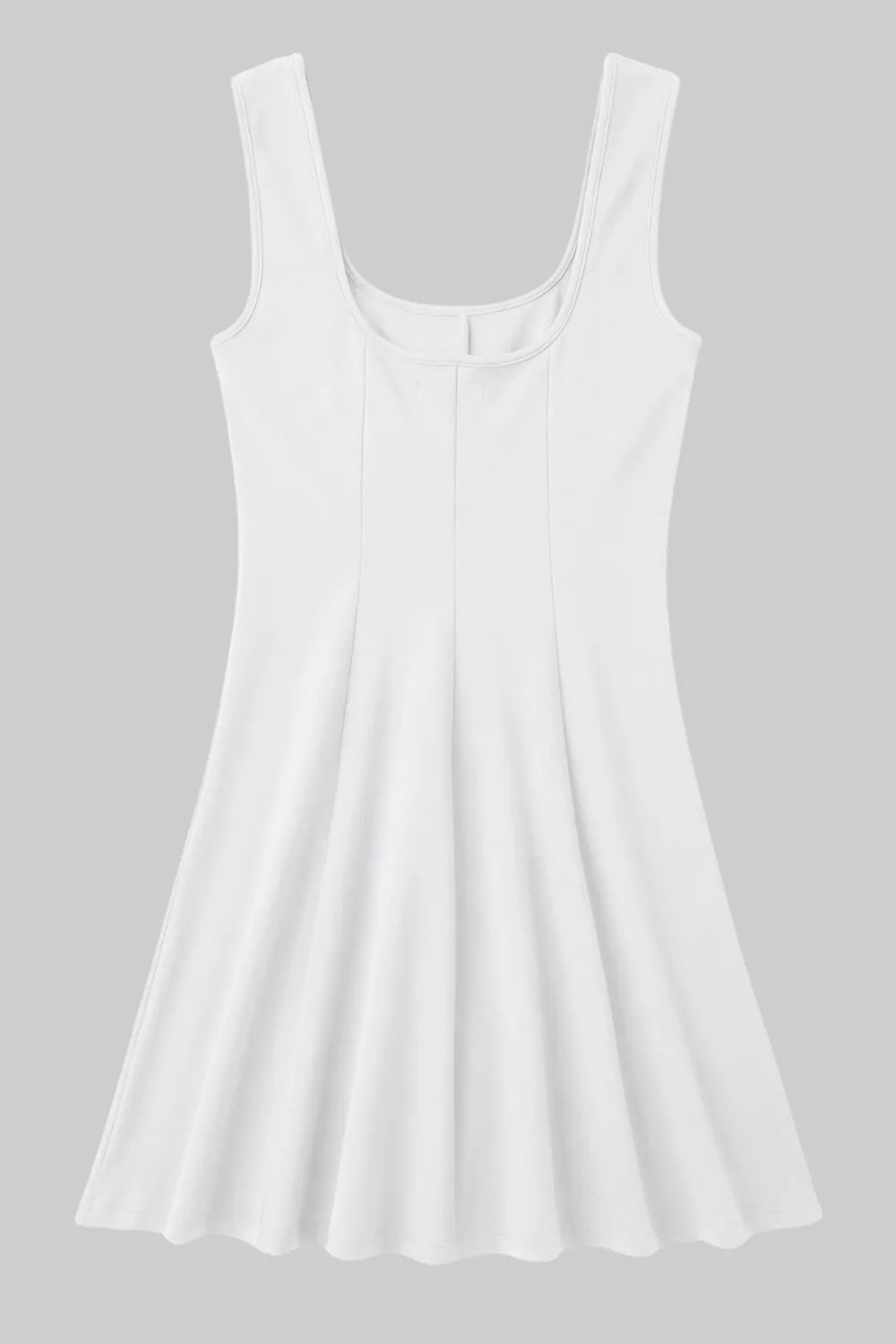 Vestido corto de escote cuadrado, sin mangas, cortes decorativos, escote en espalda y corte en a con olanes en bajo.