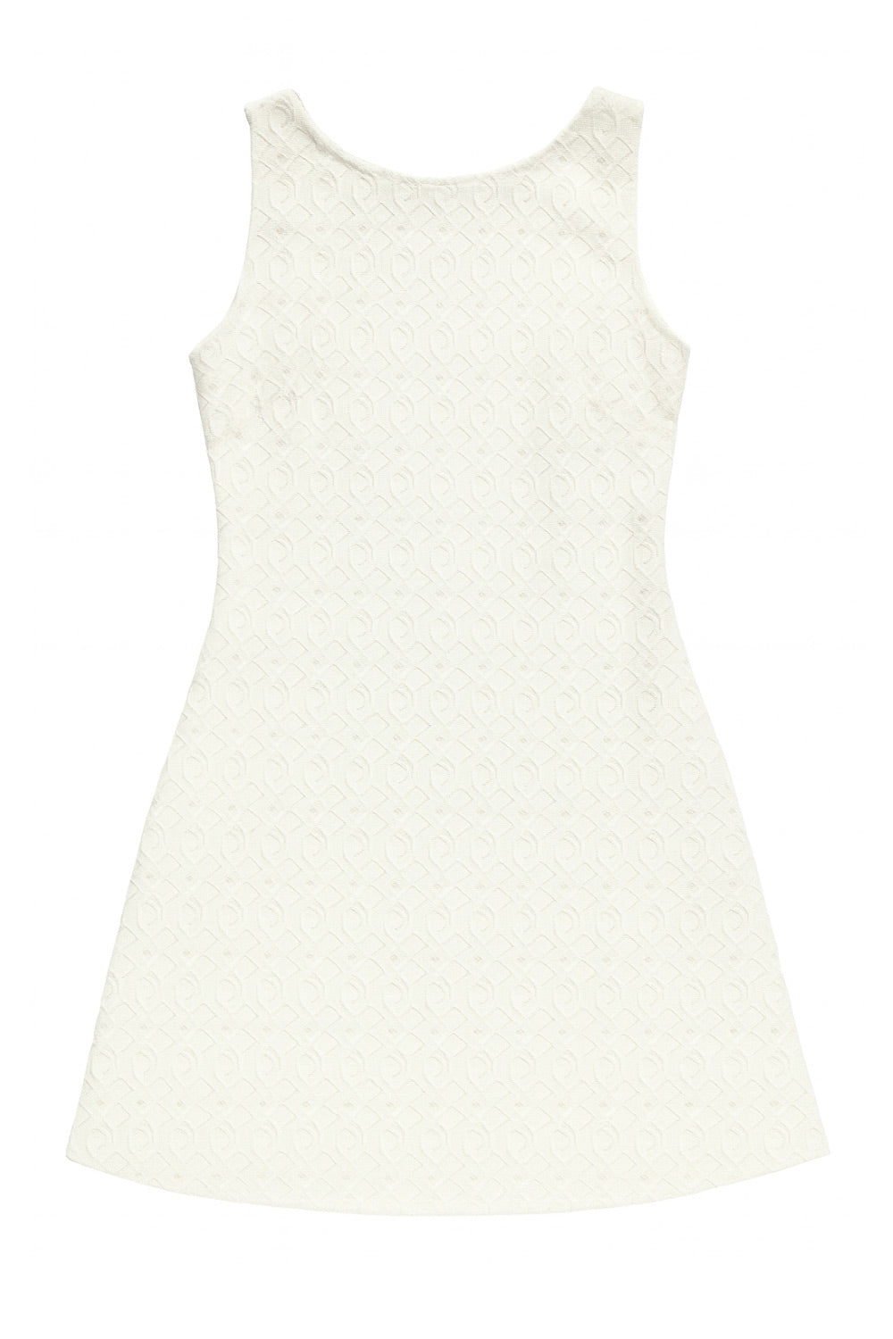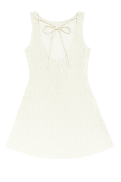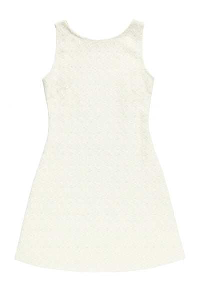 Vestido corto de fit recto, sin mangas, cuello barco y escote en espalda con lazo amarrable posterior. Detalle de textura en tejido.