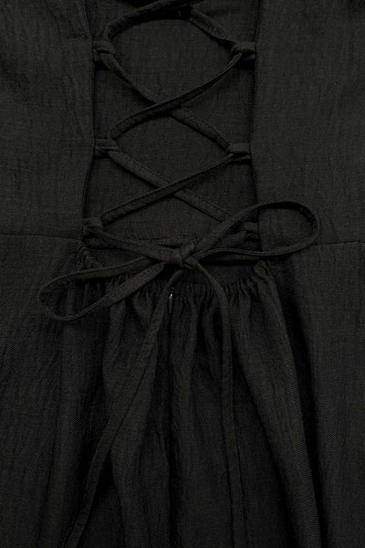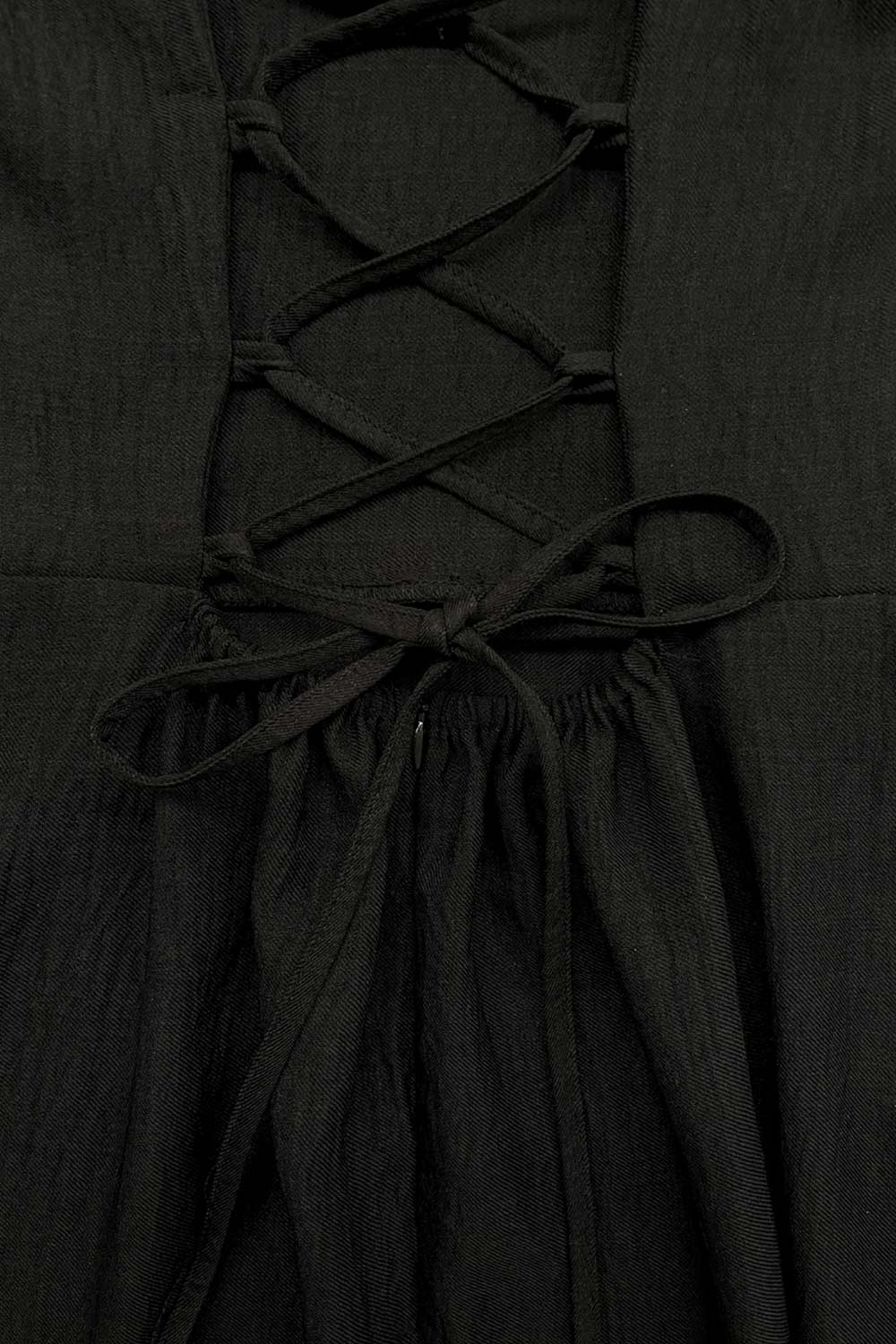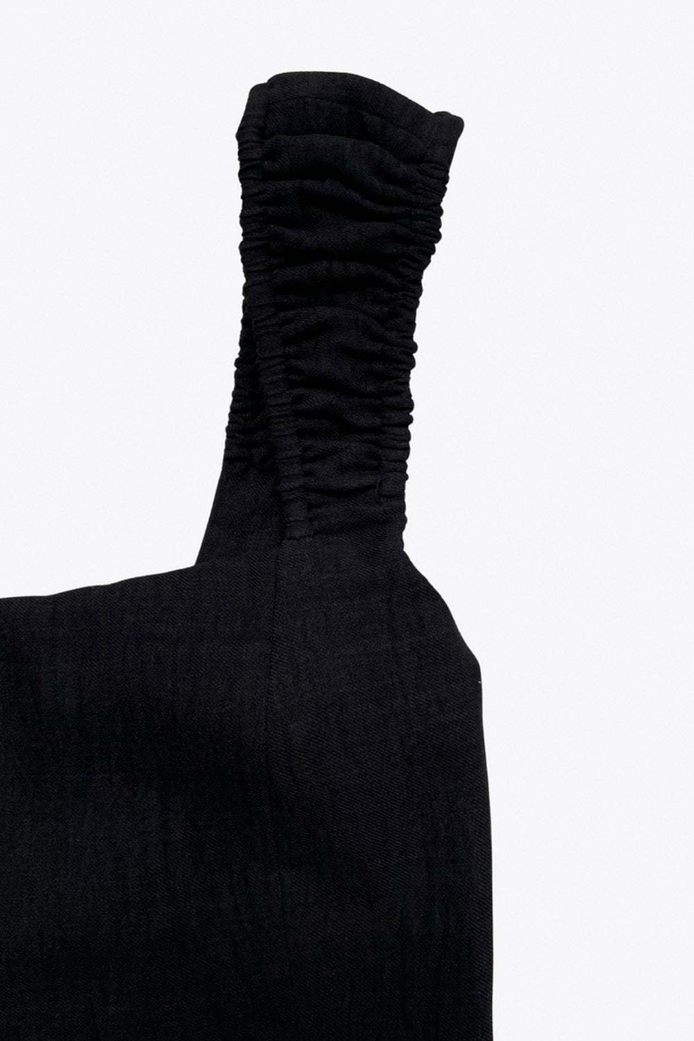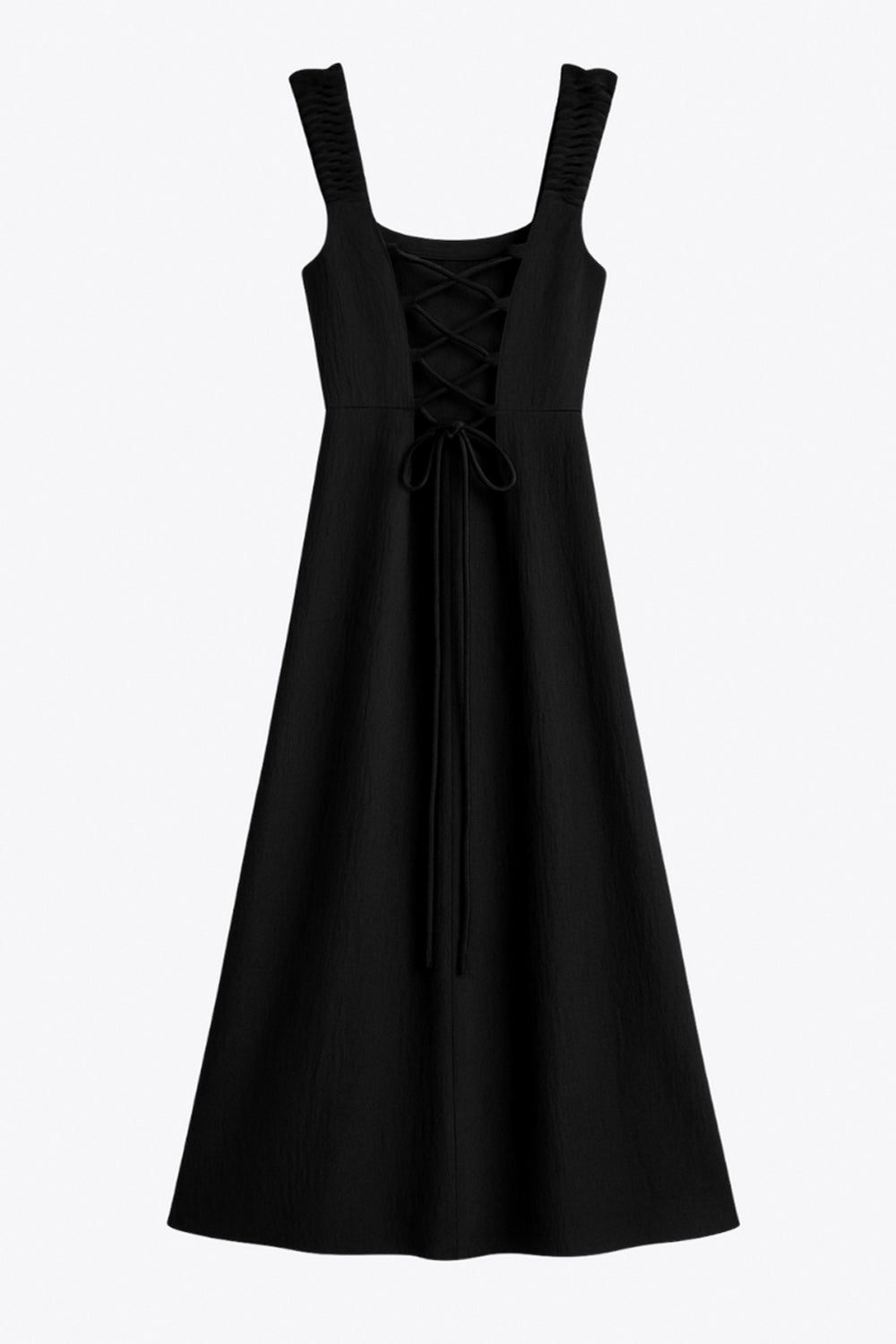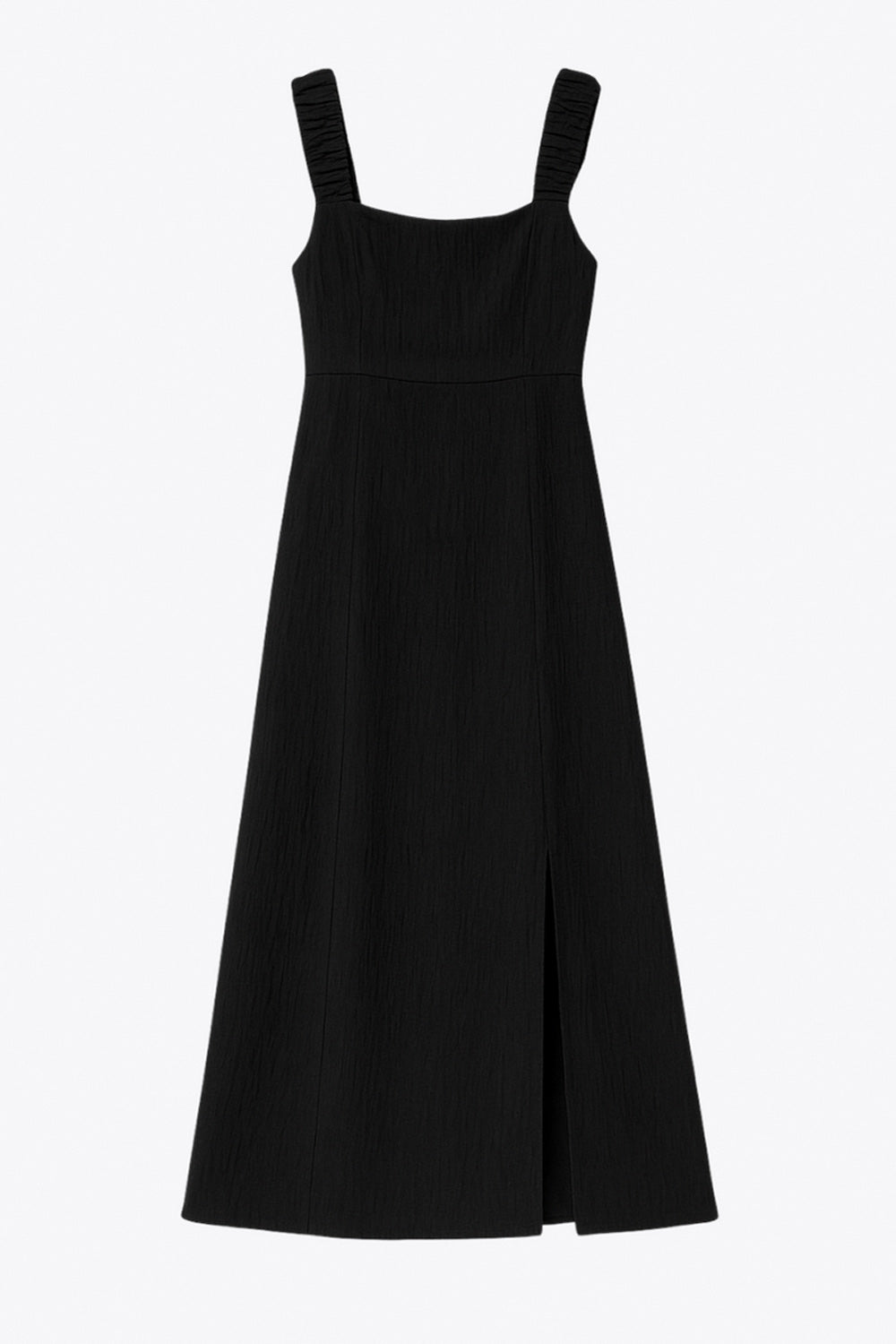 Vestido midi de fit recto, escote redondeado, corte frontal, tirantes elásticos con plisados y escote en espalda con lazado ajustable. Abertura frontal en bajo, rib elástico y cremallera oculta posterior.