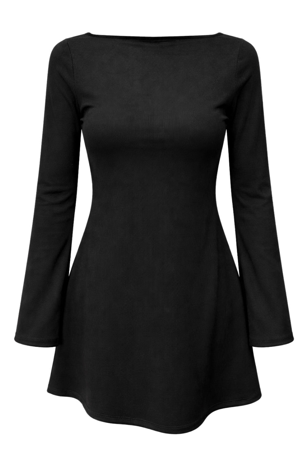 Vestido corto ajustado, rib de suede, de corte en a, manga larga con puño amplio, cuello barco y escote en espalda con lazo amarrable posterior.