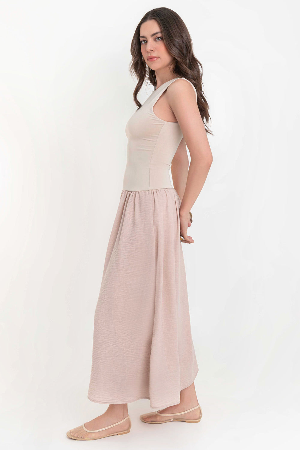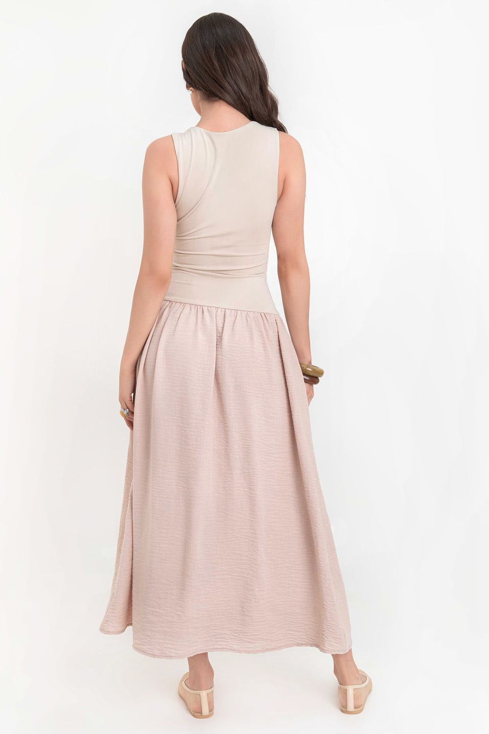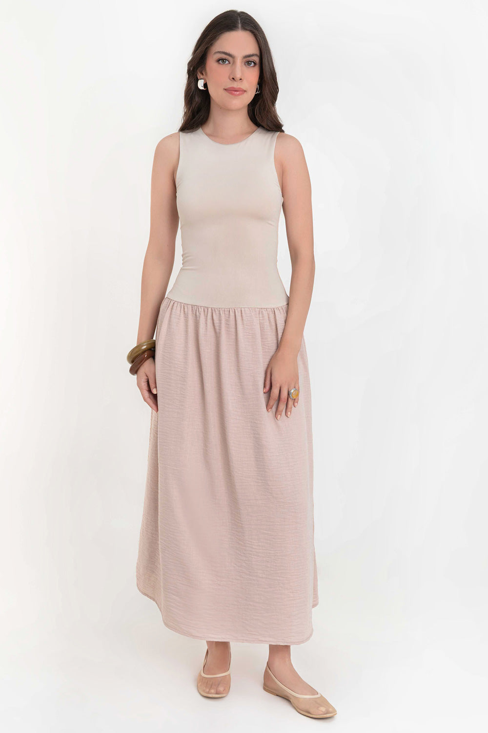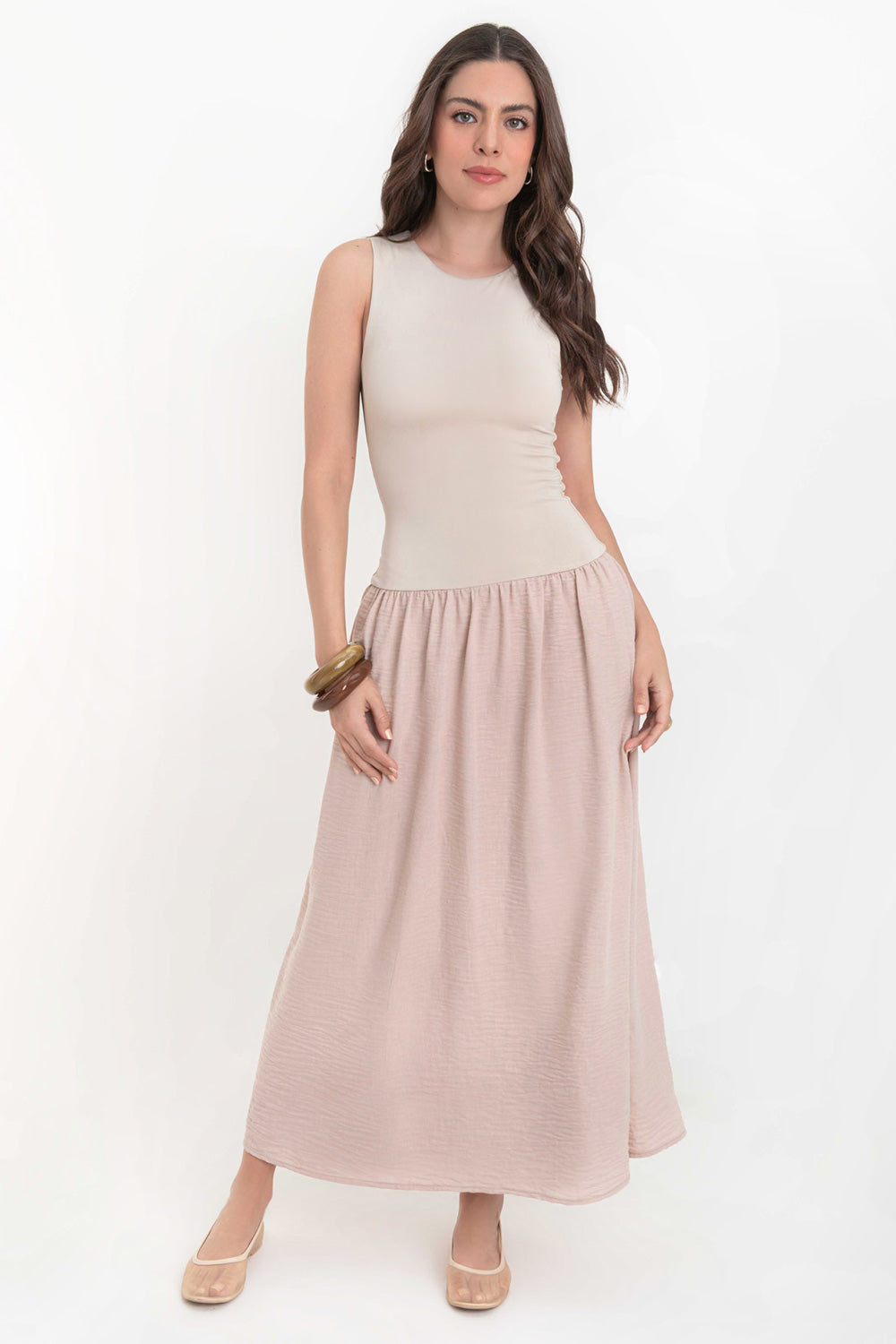Vestido maxi de fit ajustado, cuello redondo, sin mangas, corte en a, plisados en cadera y bajo en contraste.