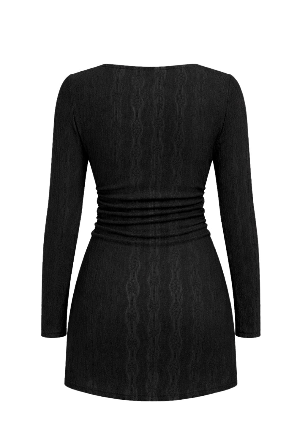 Vestido corto de fit ajustado, cuello barco, manga larga, plisados laterales en cintura y detalle de textura en tejido.