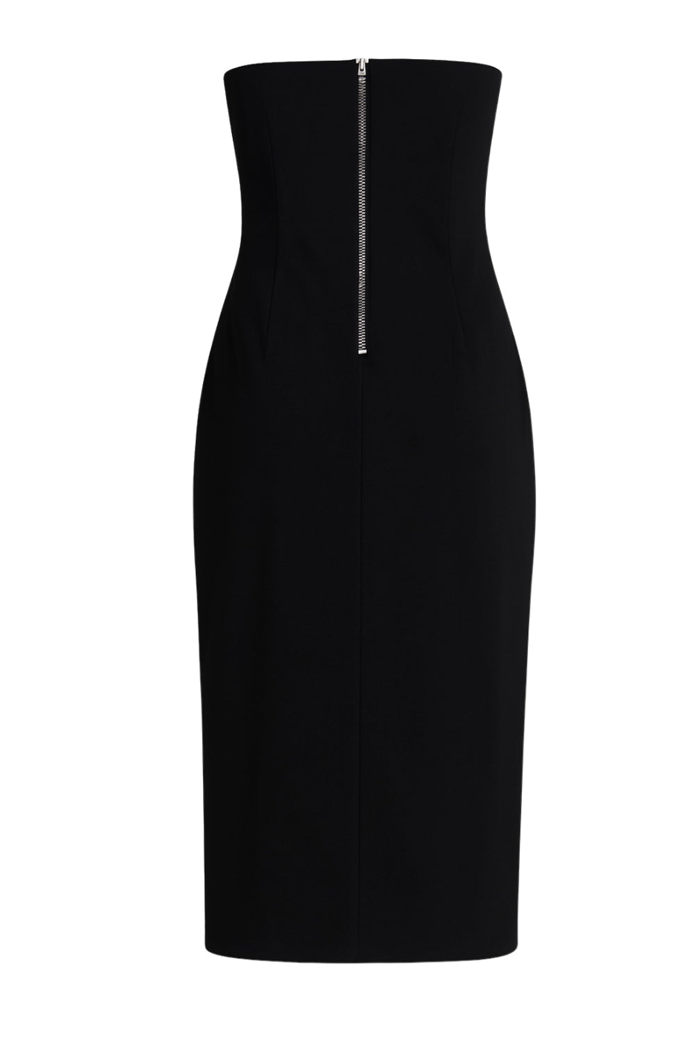 Vestido midi strapless, de fit ajustado, escote recto con detalle decorativo de plumas en borde y abertura lateral en bajo. Cierre posterior con cremallera visible en contraste.