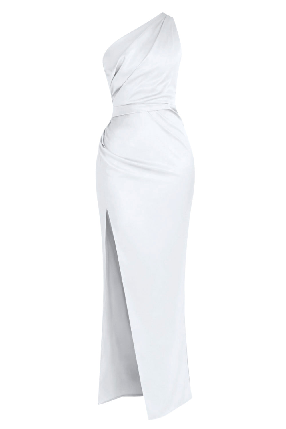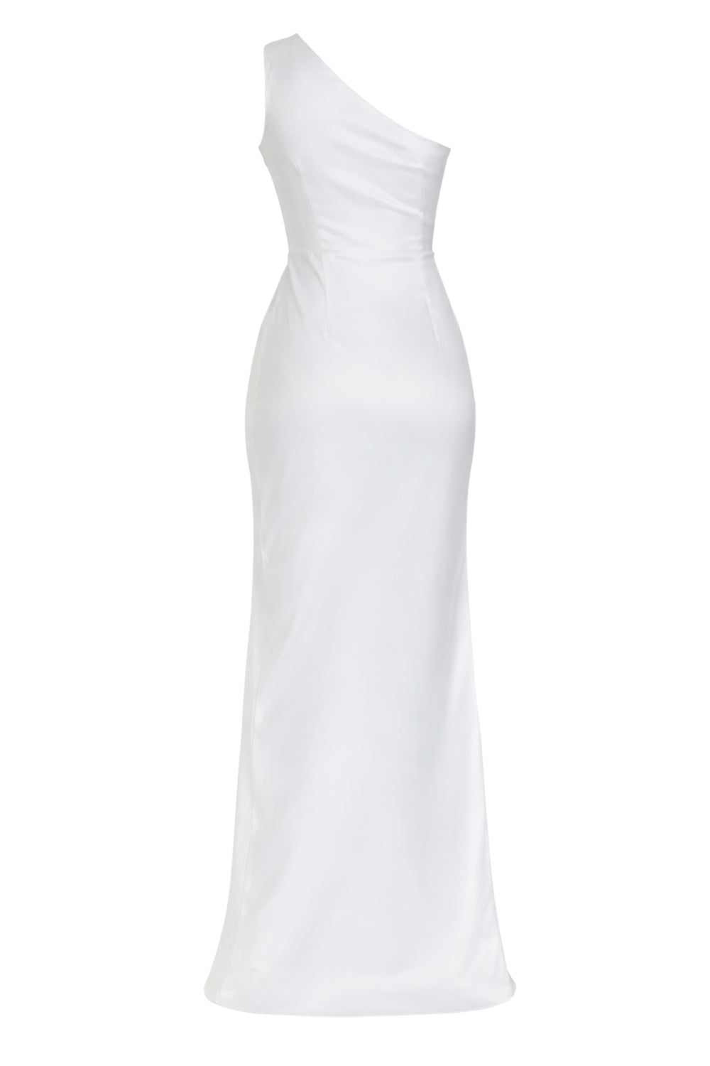 Maxi vestido satinado de fit ajustado, asimétrico de un hombro, escote diagonal, plisados en costados y abertura lateral en bajo. Cierre lateral con cremallera oculta.