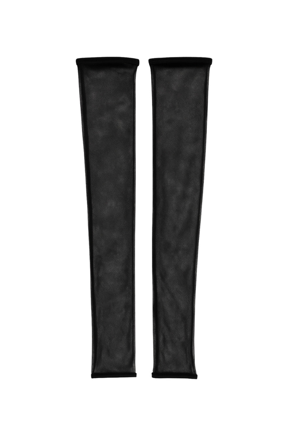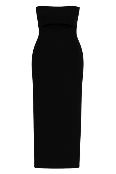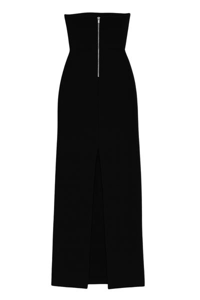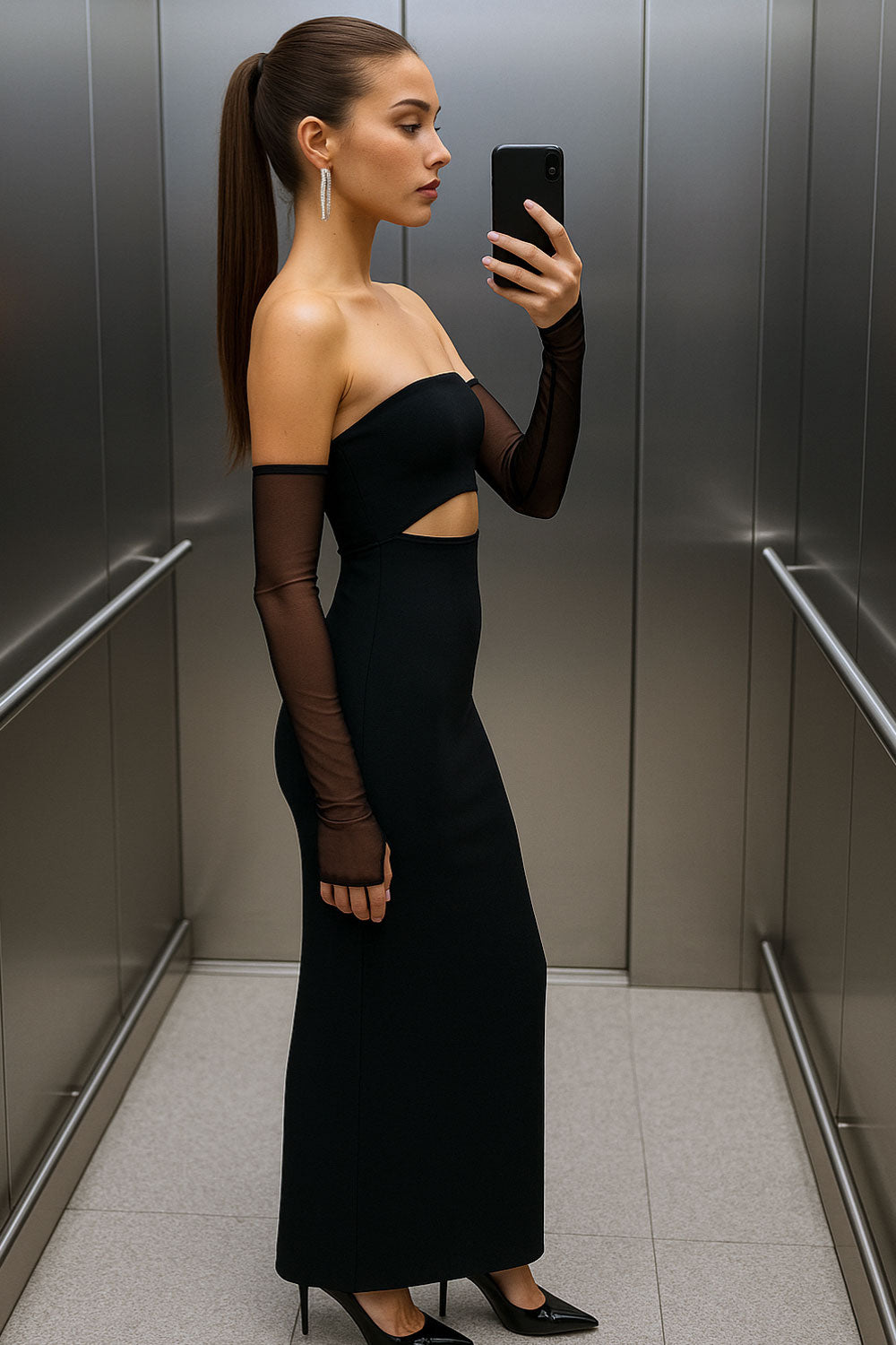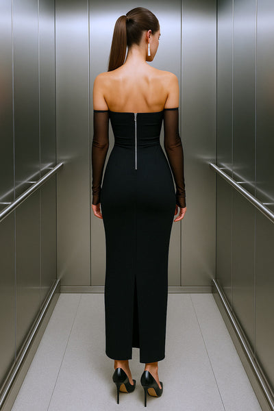 Vestido largo strapless, de fit ajustado, escote recto, cut out decorativo frontal y cierre posterior con cremallera visible en contraste. Detalle de abertura posterior en bajo y mangas decorativas de mesh en contraste.